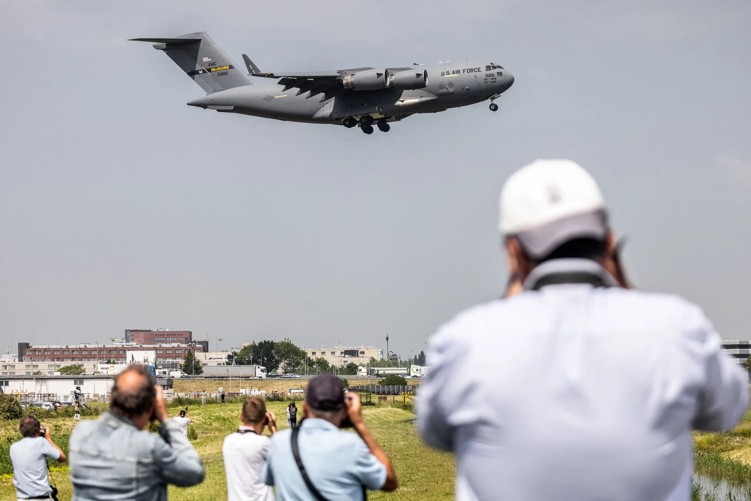 Lidé si fotografují dopravní letoun Boeing C-17 Globemaster III, který přistává na letišti Schiphol u Amsterdamu 13. června 2025. Jeffrey Groeneweg/ANP/AFP prostřednictvím Getty Images