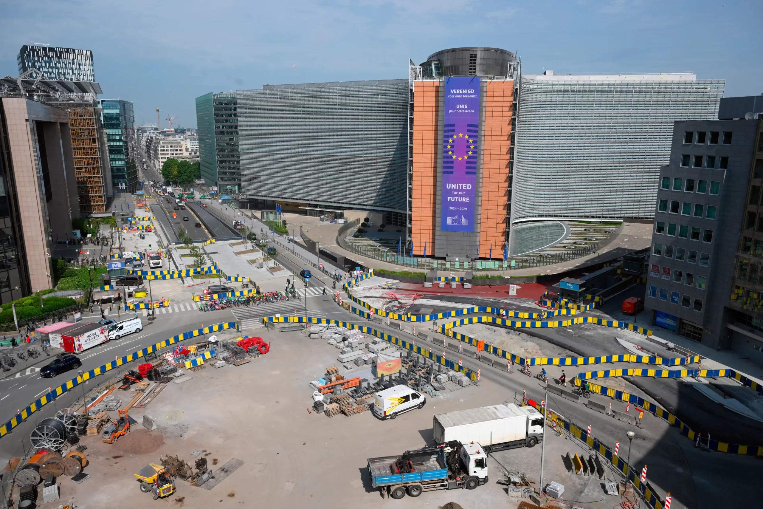 Budova Berlaymont, v níž sídlí Komise Evropské unie, a staveniště kruhového objezdu Roberta Schumana v Bruselu 13. června 2025. Nicolas Tucat/AFP via Getty Images