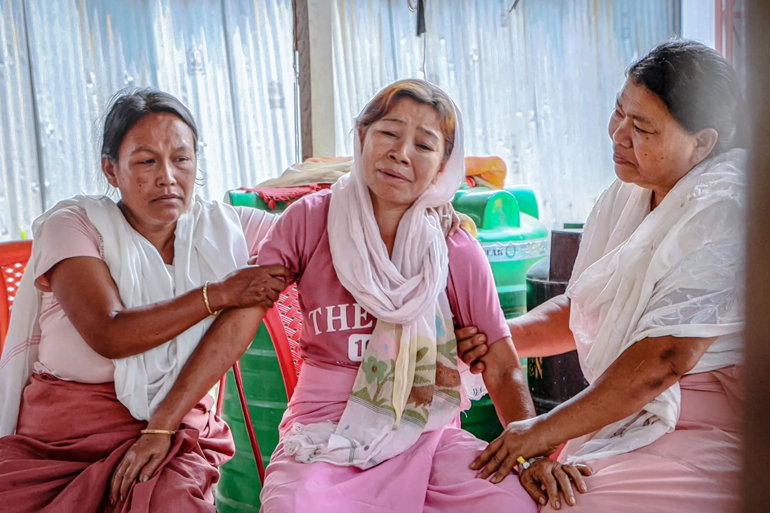 Rodinní příslušníci jednoho z členů posádky letu Air India 171 truchlí ve svém domě v Thoubal Mayai Leikai poblíž Imphalu v Indii 13. června 2025, den poté, co se letadlo zřítilo v obytné čtvrti poblíž letiště v Ahmedábádu. -/AFP via Getty Images