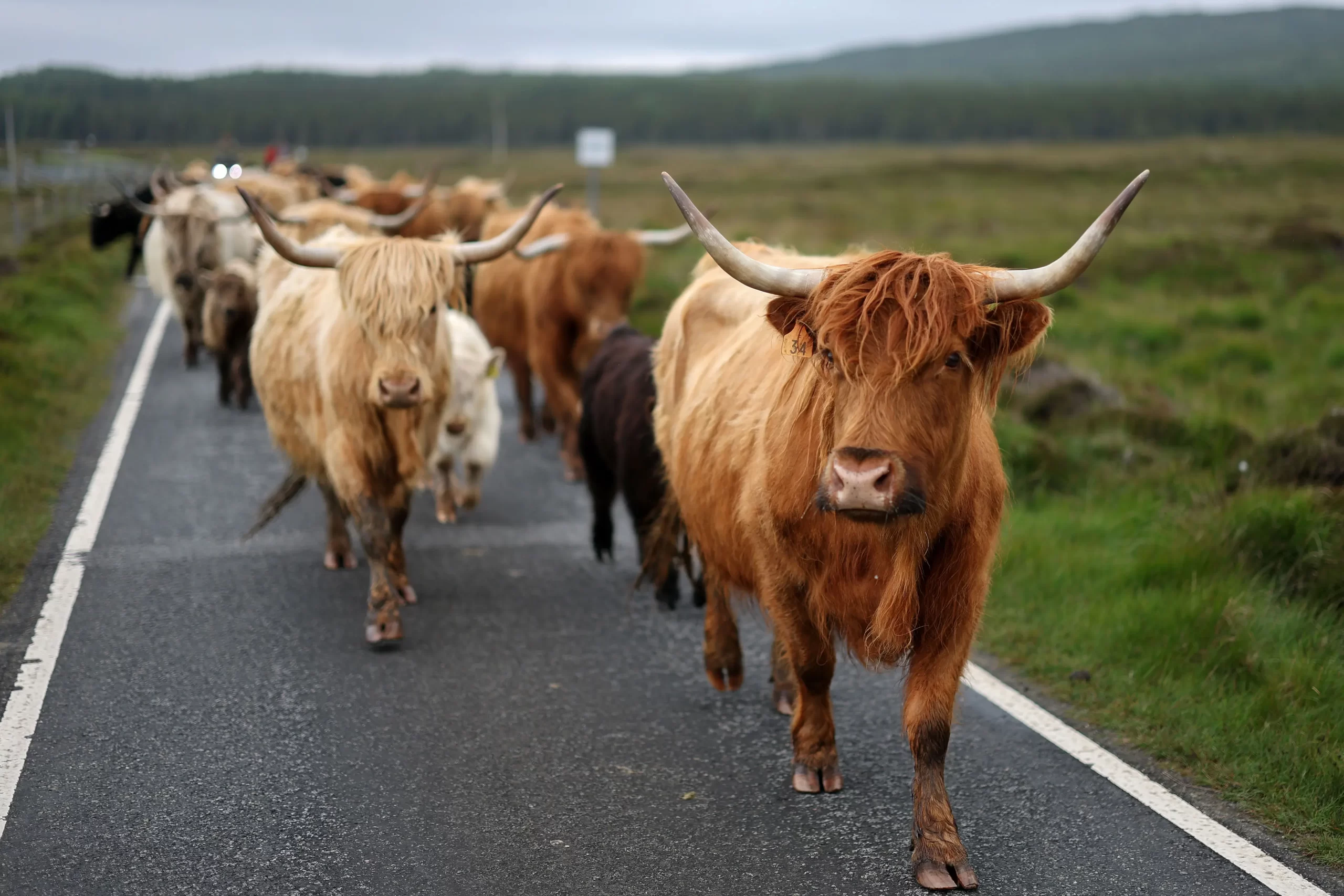 Skotské krávy jsou hnány podél silnice po přechodu z Vallay při odlivu v Sollasu ve Skotsku 13. června 2025. Každý rok v červnu se stádo skotu Ardbhan Highland vydává za odlivu na dvoukilometrovou cestu přes moře z hebridského ostrova Vallay na ostrov North Uist na pevnině, kde rodí a přes zimu se vrací spásat výživné travnaté porosty na ostrově. Jeff J. Mitchell/Getty Images