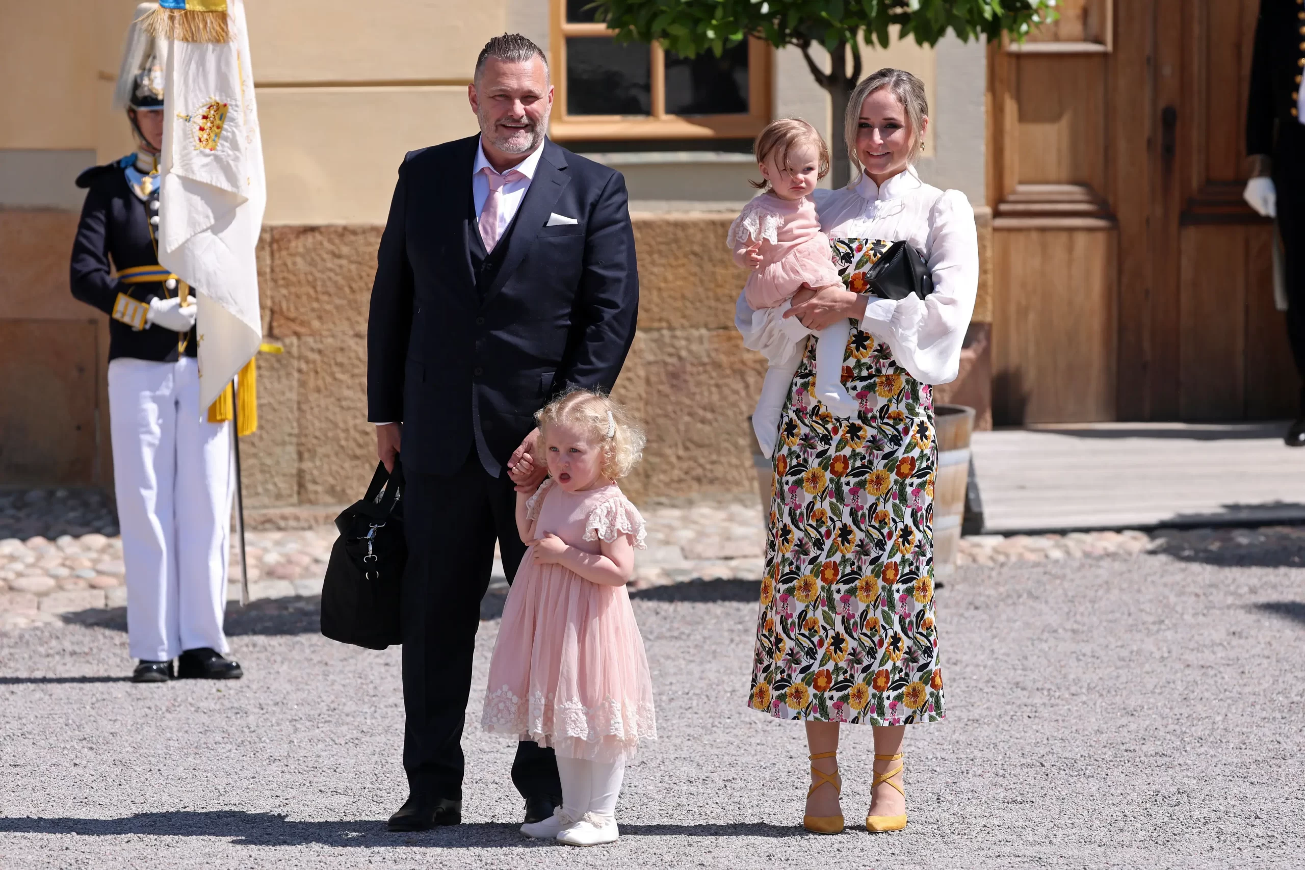Mattias Wikström a Ellie, Lily a Lina Hellqvistovy odcházejí po křtinách švédské princezny Ines v kapli Drottningholmského paláce ve Stockholmu 13. června 2025. Lina je sestrou švédské princezny Sofie. Michael Campanella/Getty Images