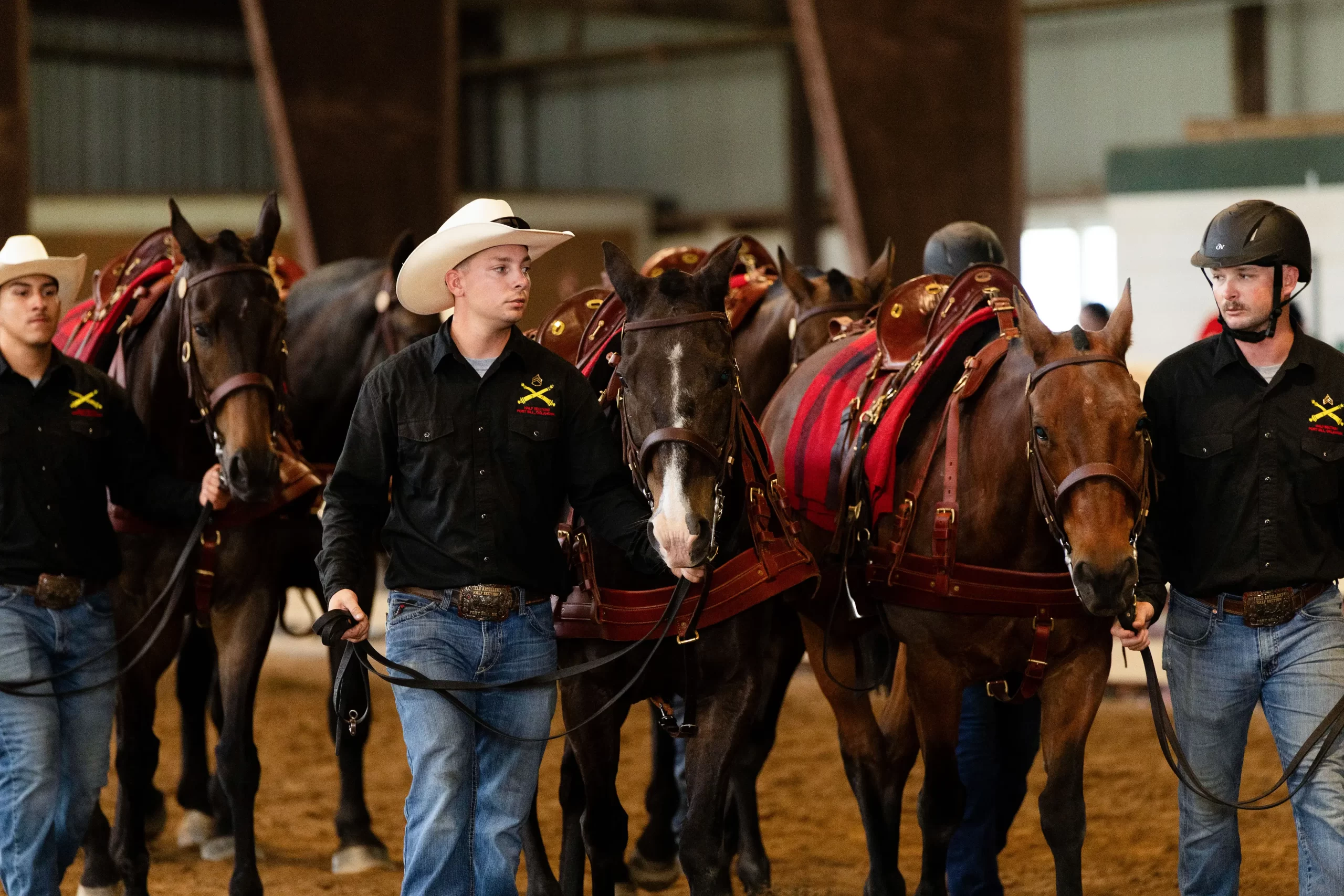 Vojáci z dělostřeleckého půloddílu Ft. Still vyvádějí koně ze stáje v parku Frying Pan Farm v Herndonu ve státě Virginia 13. června 2025. Koně z koňské jednotky budou během vojenské přehlídky k 250. výročí armády ve Washingtonu táhnout 1,5tunové dělo. Anna Moneymaker/Getty Images