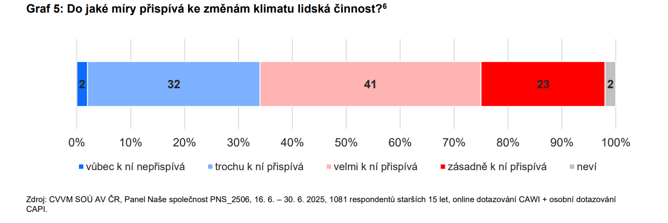„Do jaké míry přispívá ke změnám klimatu lidská činnost?“ navázal průzkum na předchozí dotaz. Většina společnosti připouští, že lidská činnost se na klimatických změnách podílí. 23 % respondentů je přesvědčeno, že člověk v ní hraje zásadní vliv, a další dvě pětiny jej vnímají jako velmi výrazný. Skoro třetina lidí si myslí, že společnost přispívá ke změně klimatu alespoň trochu. Naopak názor, že člověk změnu klimatu vůbec neovlivňuje, zastává jen dvě procenta respondentů.