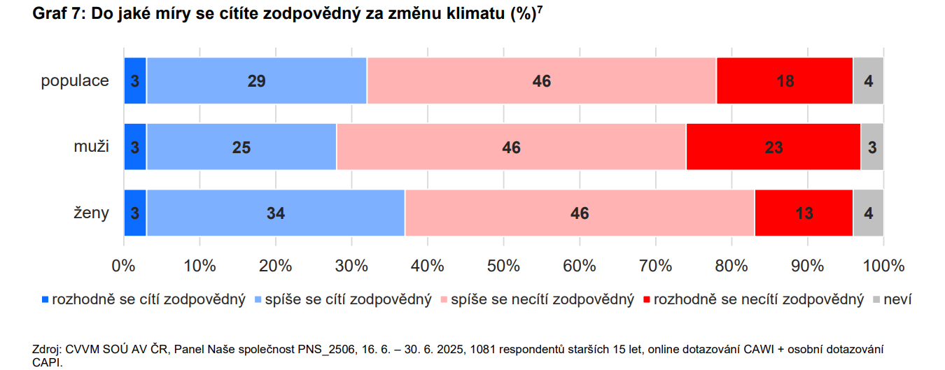 Výzkum ukázal také rozdíly mezi ženami a muži. Ženy častěji než muži zastávají názor, že lidstvo se na změnách klimatu podílí zásadním způsobem – tuto odpověď zvolilo o 11 procentních bodů více žen. Zároveň více než muži přiznávají pocit osobní odpovědnosti. Přesto se však ukazuje jistý rozpor: ačkoli většina populace připouští, že lidstvo má na změnu klimatu vliv, plných 64 % dotázaných se osobně necítí za tyto změny zodpovědná.