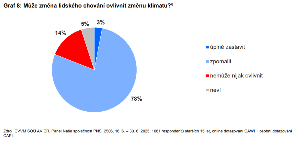 Na otázku, zda by změna lidského chování mohla ovlivnit klimatickou změnu, odpověděla většina dotázaných optimisticky. Téměř osm z deseti Čechů (78 %) věří, že chování lidí může globální oteplování alespoň zpomalit. Jen malá část populace (3 %) si myslí, že by lidstvo dokázalo klimatické změny úplně zastavit, zatímco čtrnáct procent má za to, že lidské chování nemá žádný vliv.