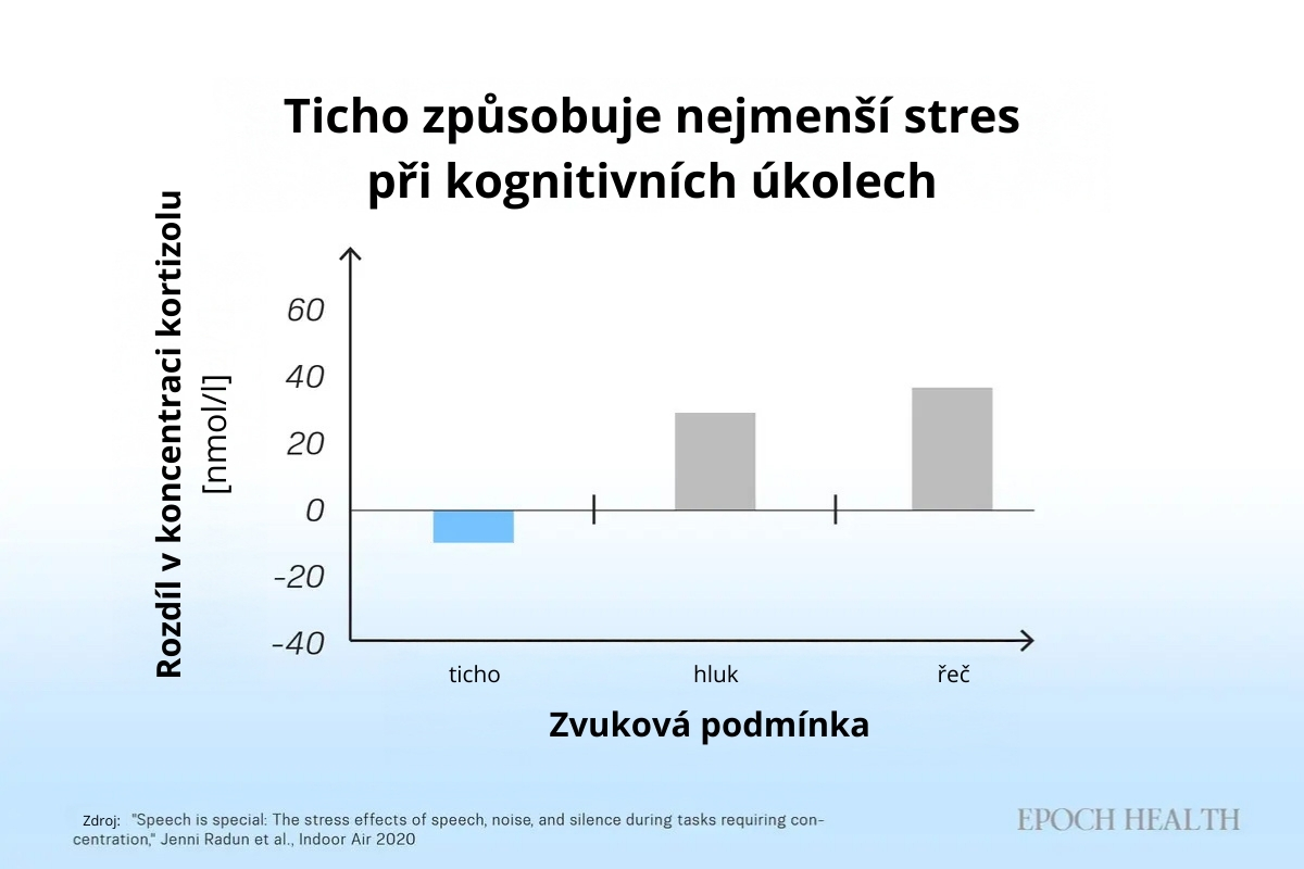 Studie z roku 2021 ukázala, že lidé pracující v tichu byli kognitivně nejméně zatíženi ve srovnání s těmi, kteří byli vystaveni mluvenému slovu nebo jiným zvukům v pozadí. Účastníci v tichu dosahovali nejvyšší přesnosti a paměťového výkonu při úkolech vyžadujících přemýšlení a zároveň udávali nejnižší míru podráždění a pocitu zátěže. Navíc u nich byly naměřeny výrazně nižší hladiny kortizolu, což svědčí o menším fyziologickém stresu. Vědci dospěli k závěru, že redukce hluku vytváří nejlepší prostředí pro práci vyžadující soustředění.
