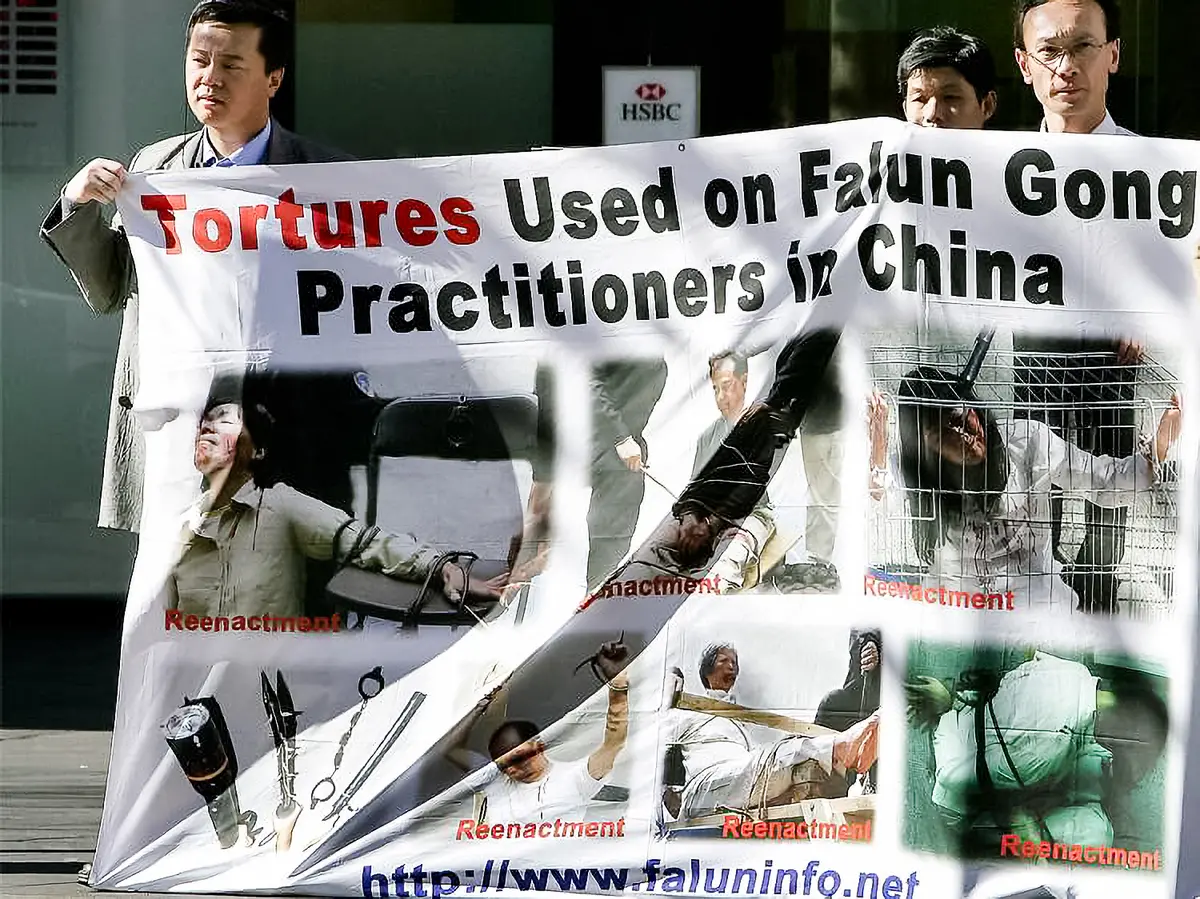 Praktikující Falun Gongu rozvinuli poblíž čínské čtvrti v Sydney 20. července 2005 transparent s rekonstrukcemi mučení, které čínský komunistický režim používá proti praktikujícím. (Greg Wood / AFP prostřednictvím Getty Images)