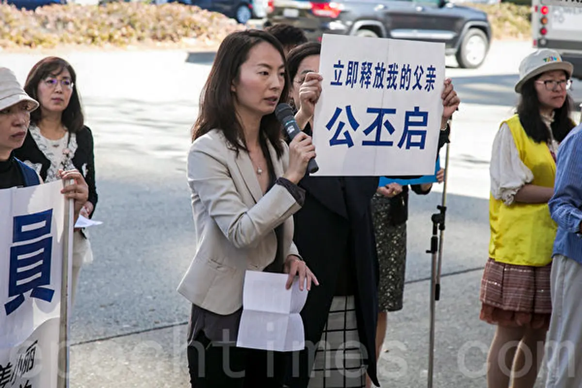 Gong Xiaoyan na archivním snímku žádá před čínským konzulátem v San Francisku o propuštění svého otce v Číně. (Cao Jingzhe / Epoch Times)
