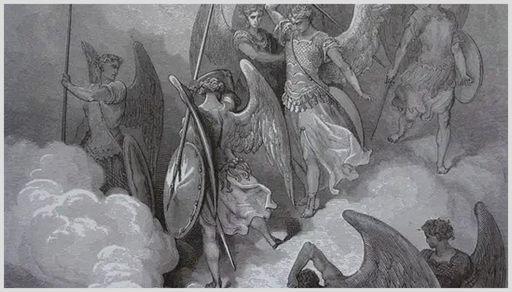 Boží armádu vedou archandělé Michael a Gabriel. Jejich úkolem je najít Luciferovo vojsko a zastavit vzpouru. Najdou Lucifera, jak chystá přepad. Ten stojí vysoko na voze uprostřed zlatých andělů se zlatými štíty. Obě armády se postaví proti sobě a čekají na povel.