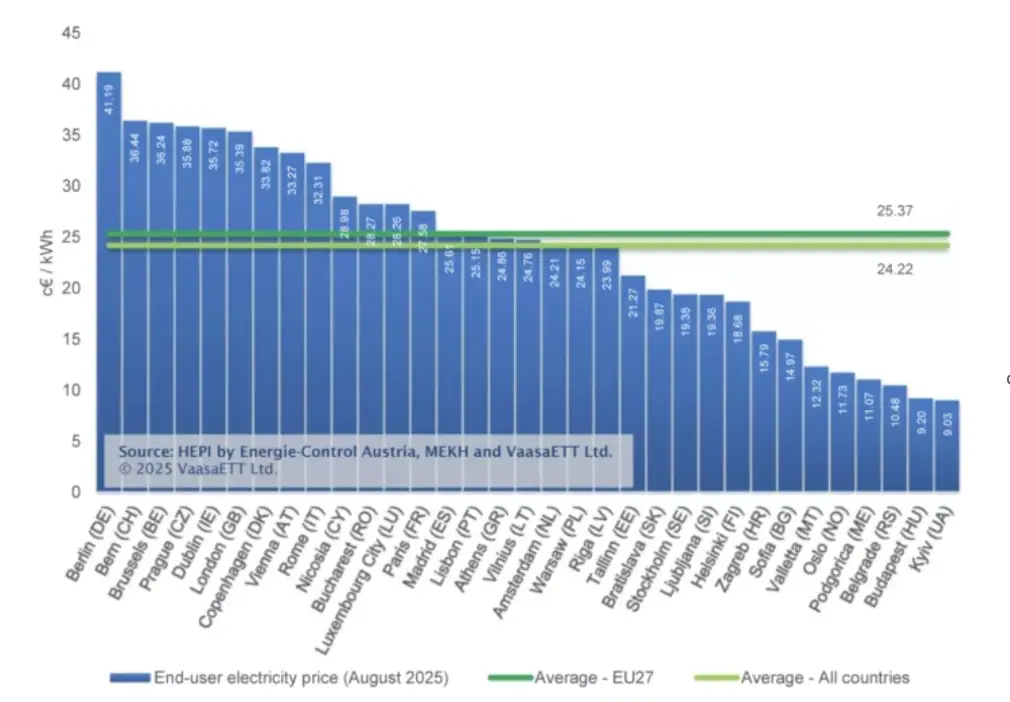 Letos v srpnu stálo na pomyslné bedně „šampionů“ v koncových cenách elektřiny pro domácnosti Německo. Podle Indexu nezávislých cen energie pro domácnosti (HEPI) s cenou 41,19 eurocentů (v přepočty dle aktuálního kursu asi 10,1 Kč) za kilowatthodinu (ct/kWh) Německo předčilo druhé Švýcarsko s cenou 36,44 ct/kWh. Těsně za Švýcarskem následují Belgie, Česká republika, Irsko a Velká Británie s cenami v rozmezí od 36,24 do 35,39 centů za kWh. Ve svém pravidelném srovnání zemí zkoumá HEPI proto průměrné ceny elektřiny v příslušných 33 hlavních městech států. Ukazuje se, že ceny elektřiny se mohou v závislosti na poloze zákazníka v Evropě lišit více než čtyřnásobně. To je patrné i při pohledu na opačný konec stupnice.
