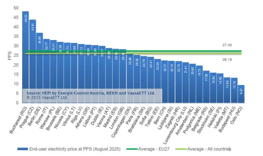 Nejnižší ceny elektřiny pro domácnosti dle kritérií parity kupní síly (PPS) jsou v Oslu, Budapešti, Vallettě a Helsinkách, zatímco nejvyšší jsou v současné době v Bukurešti, Praze, Berlíně a Římě. Většina zemí střední a východní Evropy má obvykle ceny elektřiny, které jsou relativně nízké ve srovnání s obecnou úrovní cen v dané zemi a pod evropským průměrem. Bukurešť, Praha, Riga, Vilnius a Varšava jsou jedinými hlavními městy mezi zeměmi střední a východní Evropy, kde byla cena elektřiny v srpnu 2025 nad evropským průměrem. A našinec si jen s trpkostí a také se vztekem povzdychne: „Když vydělávám méně, musím platit více.“ A to zdaleka neplatí jen pro elektřinu.