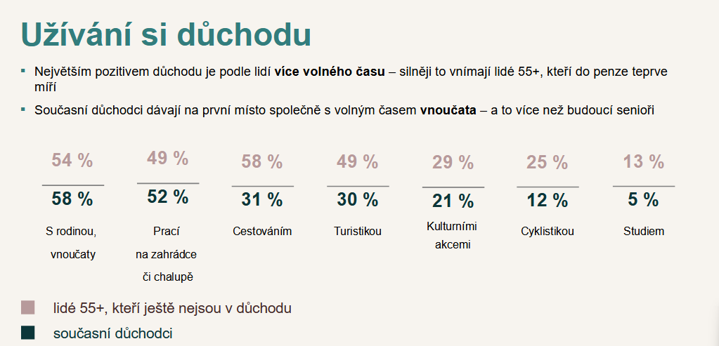 Například cestovat chce o 27 procent více lidí ve věku od 55 let (kteří v důchodu nejsou) než současní důchodci. Za kulturou plánuje vyrazit o 8 procent více osob, obdobně to podle průzkumu vypadá i u cyklistiky, kterou má v úmyslu provozovat o 13 procent více lidí. Naopak čas rodině a vnoučatům hodlá věnovat o dva procentní body méně lidí v předdůchodovém věku než současní důchodci.