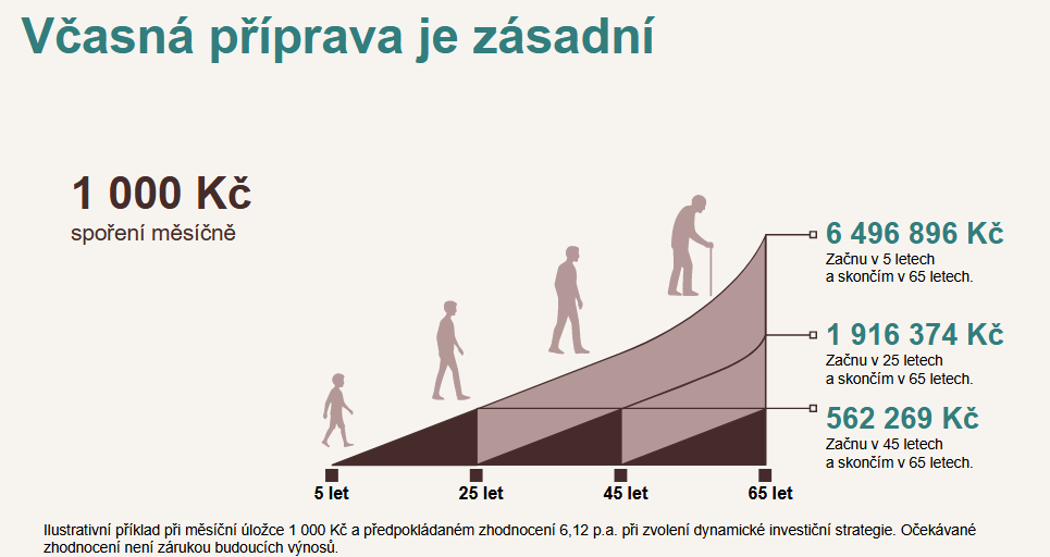 Většina lidí si dle firmy začíná peníze strádat kolem 42 let a odhaduje, že pokud si lidé začnou kolem čtyřicítky odkládat tisíc korun měsíčně, do důchodu budou se zhodnocením a státním příspěvkem mít přibližně půl milionu korun. Pokud si člověk začne odkládat již v pěti letech, přijde do důchodu s přibližně šesti a půl miliony korun, což podle Zelinkové odpovídá přibližně 30 tisícům měsíčně v důchodu.