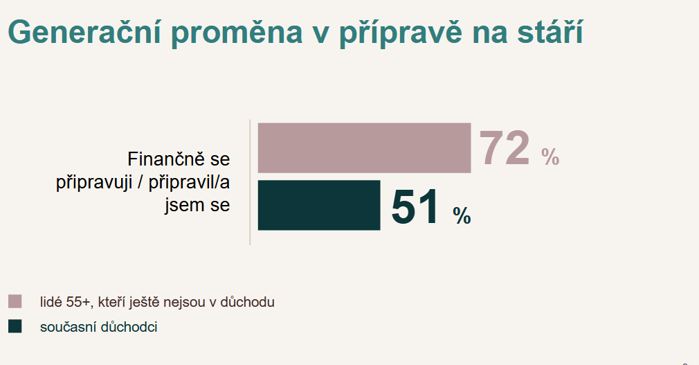 Bezmála tři čtvrtiny osob, které nejsou v důchodě, se na něj finančně připravují. Ze současných důchodců se na něj připravila přibližně polovina, vyplývá z průzkumu. „Lidé si čím dál víc uvědomují, že právě státní důchod, na který sice spoléhají jako na zdroj hlavního příjmu, pokryje spíše pouze elementární potřeby,“ sdělila Zelinková a dodala, že pokud si lidé chtějí zachovat svou dosavadní životní úroveň, jsou často finančně zodpovědnější a proaktivnější.