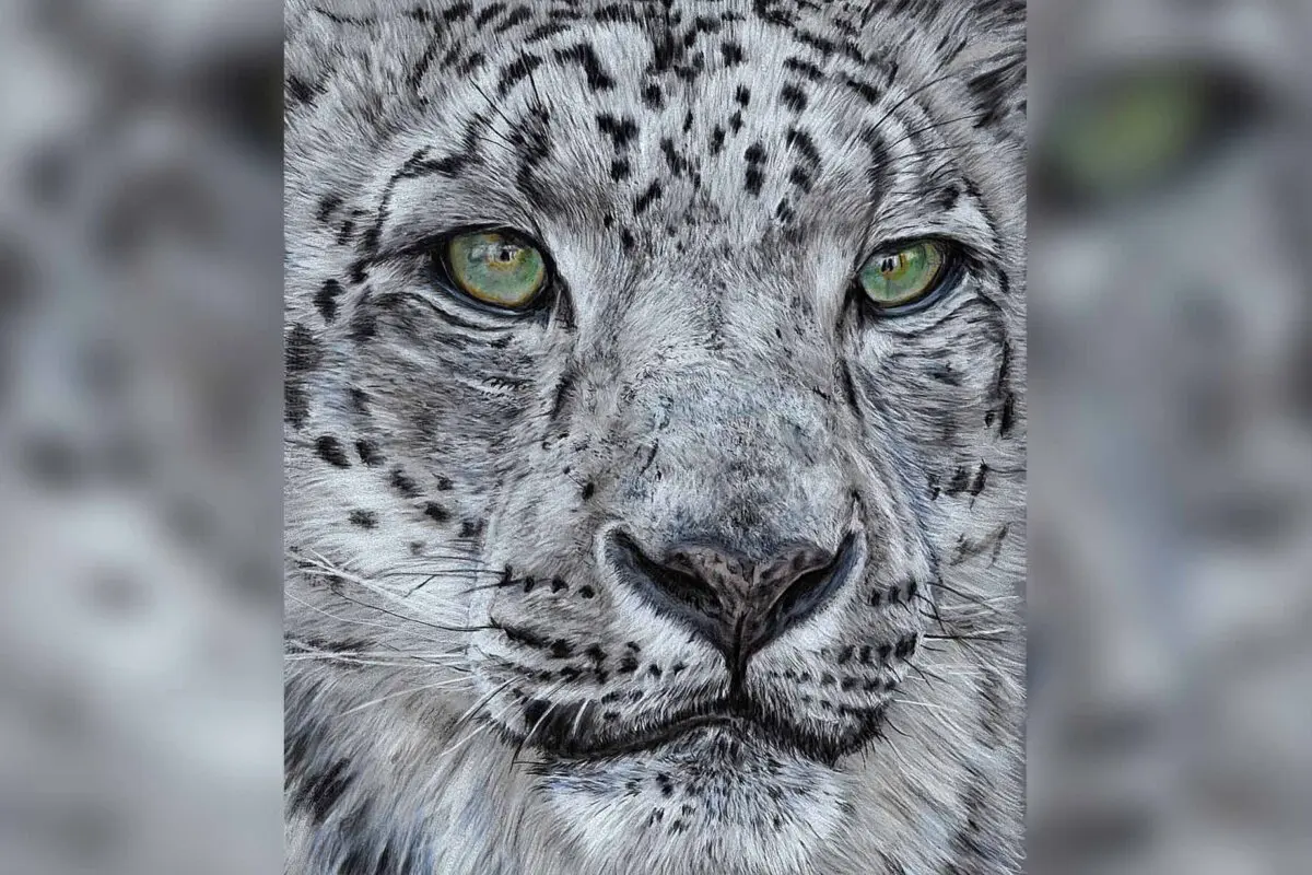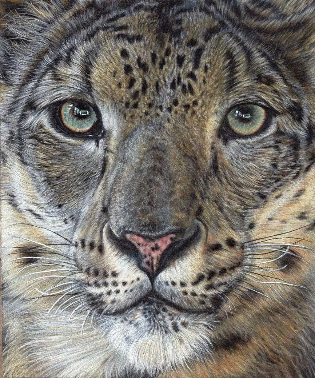 „Levhart sněžný“, jedna z prvních kreseb barevnými tužkami po jejím návratu k umění v roce 2012; získala první cenu v kategorii Začátečník v soutěži časopisu Colored Pencil Magazine. (S laskavým svolením Lisy Watkinsové)