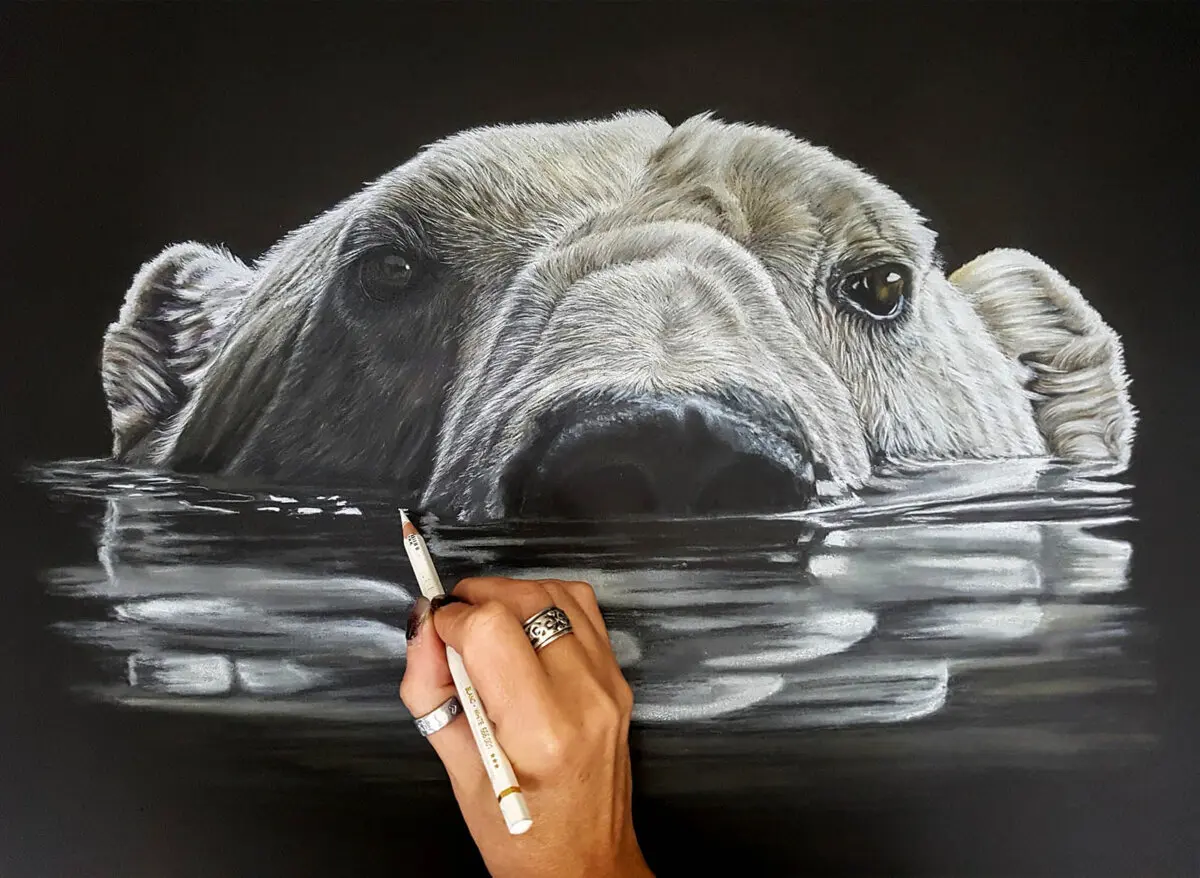 Začít akvarelovou kresbou, která se lehce navlhčí, umožňuje pigmentu zapustit se do vlákna papíru nebo pastelového podkladu a vytvořit měkkou základní vrstvu. Ta je ideální pro následné jemné detaily a vznik hloubky: obecnější tvary se mírně rozplývají, zatímco ostré detaily – jako srst nebo odlesky – vystupují.