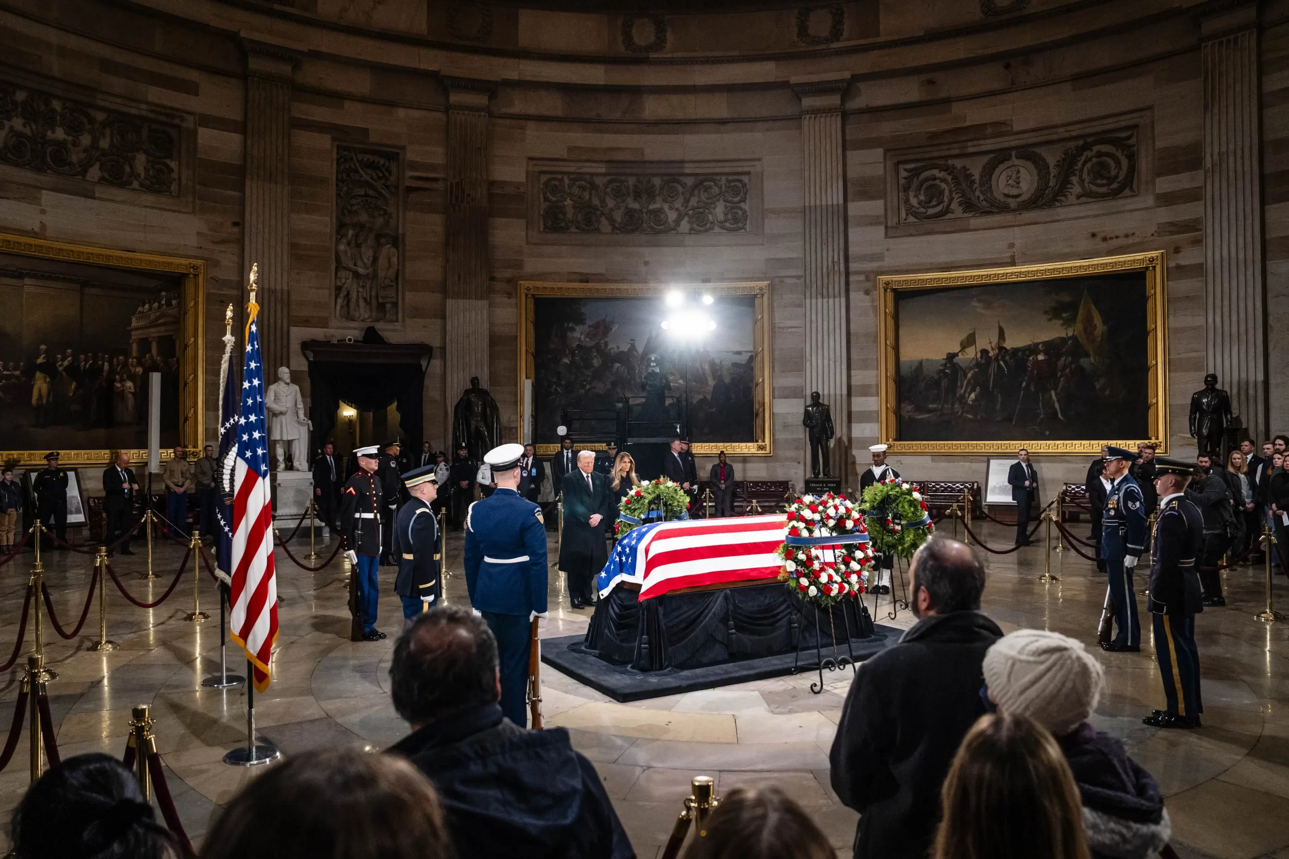 Nově zvolený prezident Donald Trump a Melania Trump vzdávají úctu rakvi bývalého prezidenta Jimmyho Cartera v rotundě Kapitolu ve Washingtonu, 8. ledna 2025. (Madalina Vasiliu / The Epoch Times)