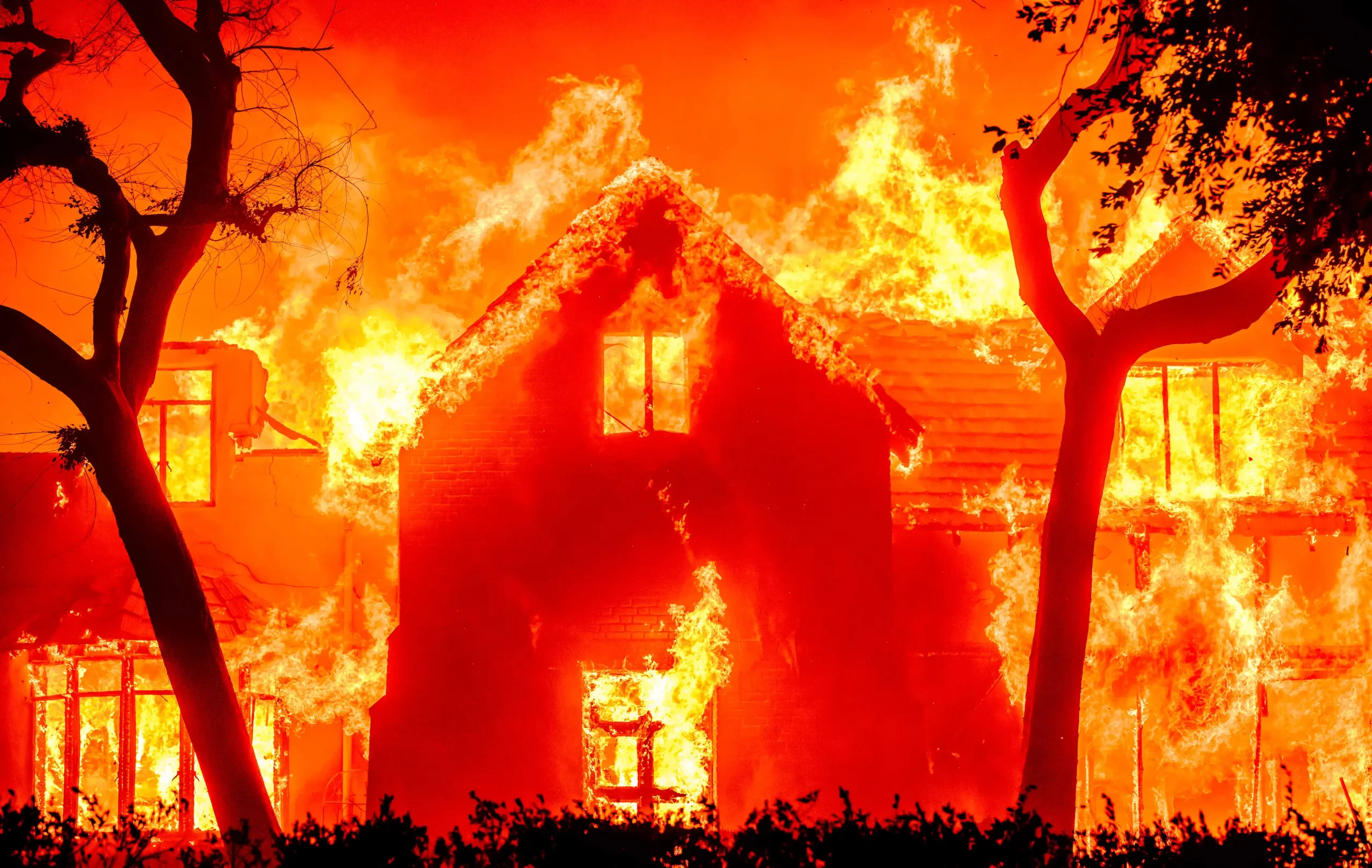 Dům pohlcený plameny během požáru Eaton Fire v oblasti Altadena v okrese Los Angeles v Kalifornii, 8. ledna 2025. Silný lesní požár ničil budovy a vyvolal masové evakuace, zatímco oblastí se prohnaly větry o síle hurikánu. (Josh Edelson / AFP via Getty Images)