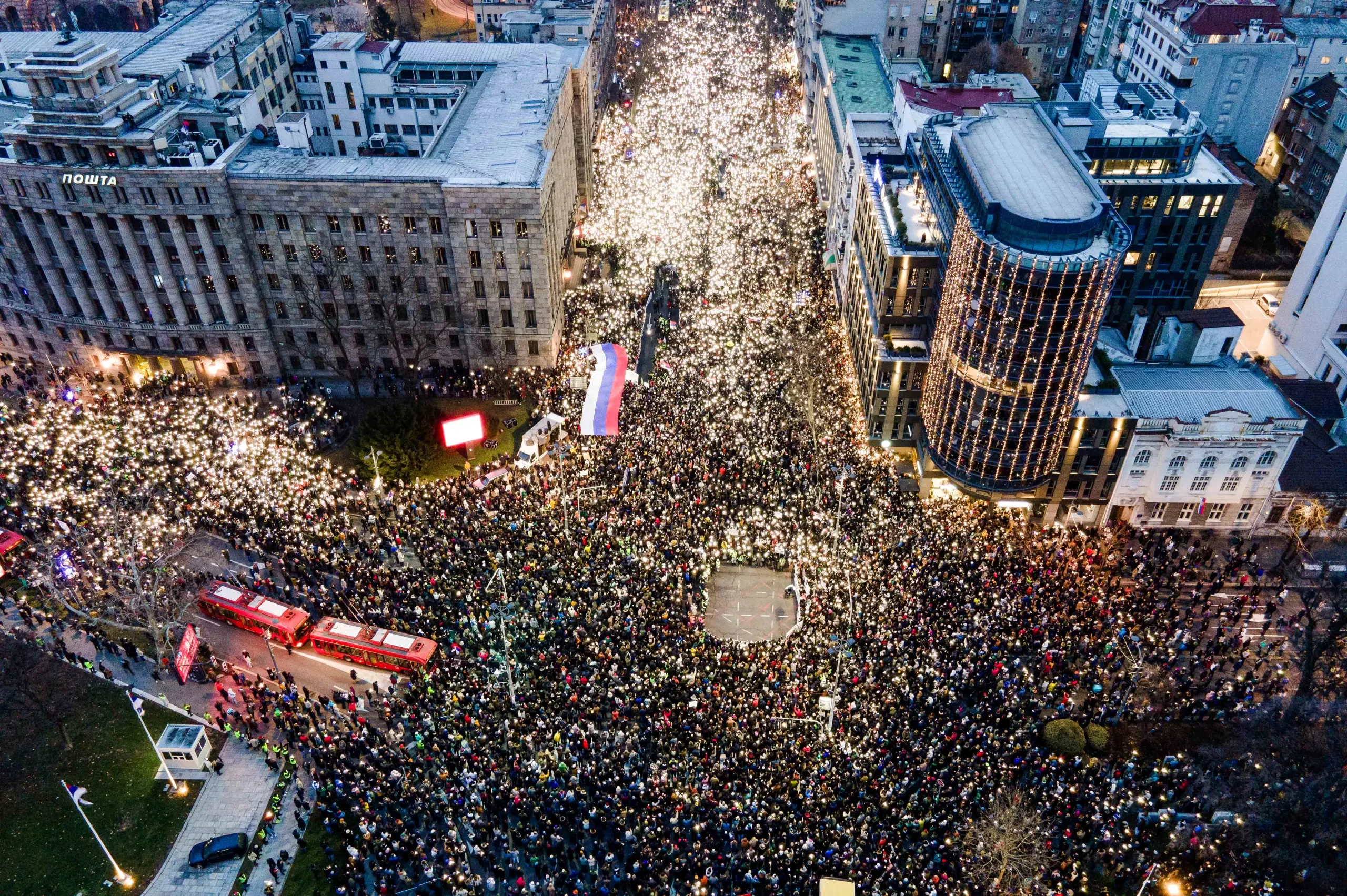 Demonstranti a studenti se shromažďují před Ústavním soudem Srbska během protestu požadujícího vyvození odpovědnosti za tragédii na železniční stanici Novi Sad v Bělehradě, 12. ledna 2025. (Tadija Anastasijevic / AFP via Getty Images)