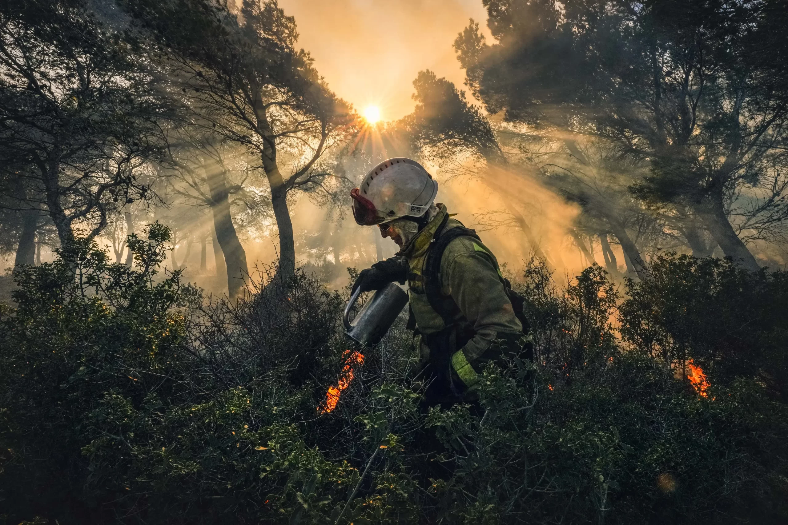 Hasič zapaluje kontrolovaný oheň v lese v oblasti Bages v departementu Aude na jihozápadě Francie, 18. ledna 2025. (Idriss Bigou-Gilles / AFP via Getty Images)