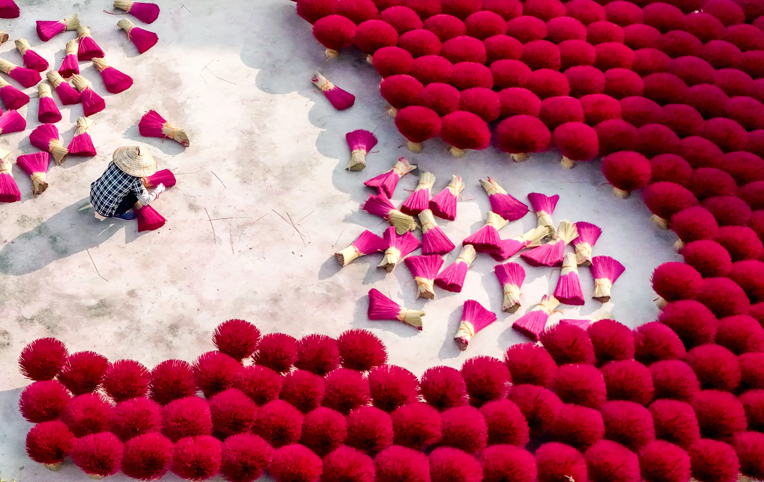 Dělník suší vonné tyčinky na nádvoří ve vesnici Quang Phu Cau na okraji Hanoje ve Vietnamu 21. ledna 2025. (Nhac Nguyen/AFP via Getty Images)