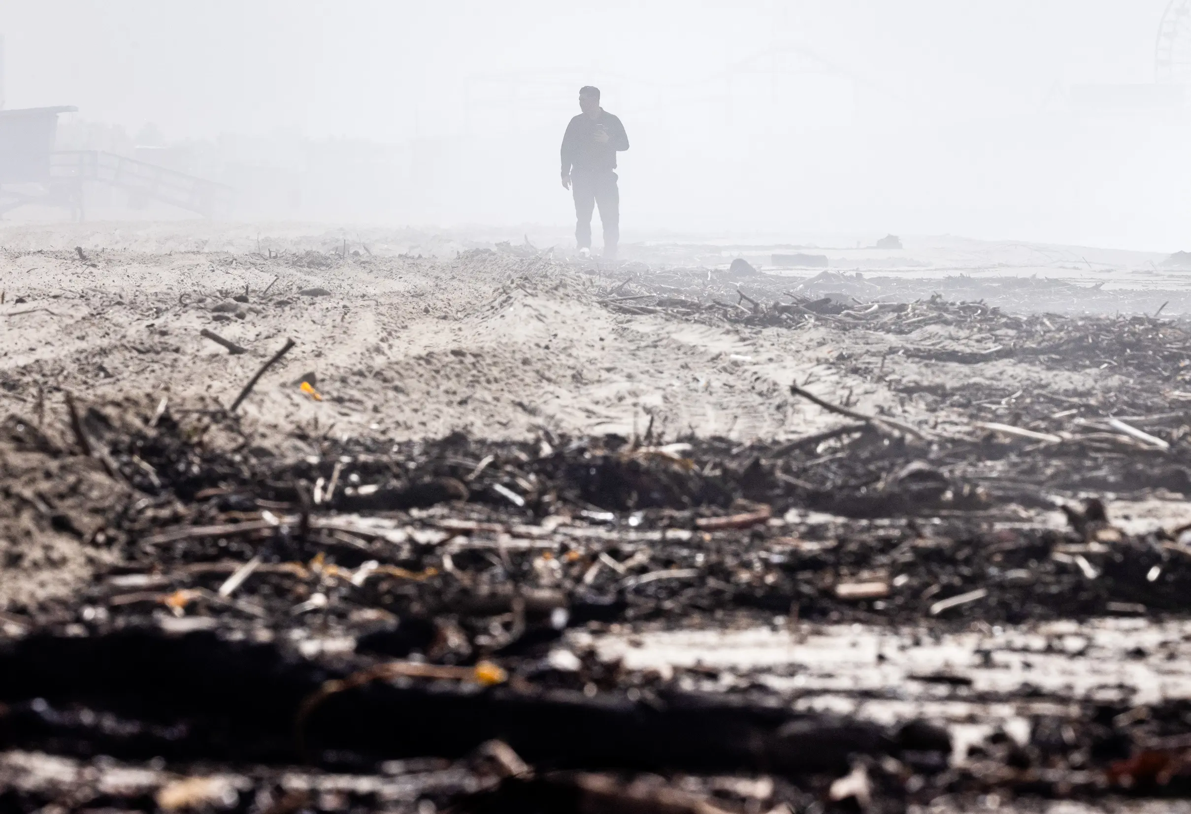 Muž prochází troskami po požáru Palisades a silných deštích v Santa Monice v Kalifornii, 27. února 2025. (John Fredricks / The Epoch Times)