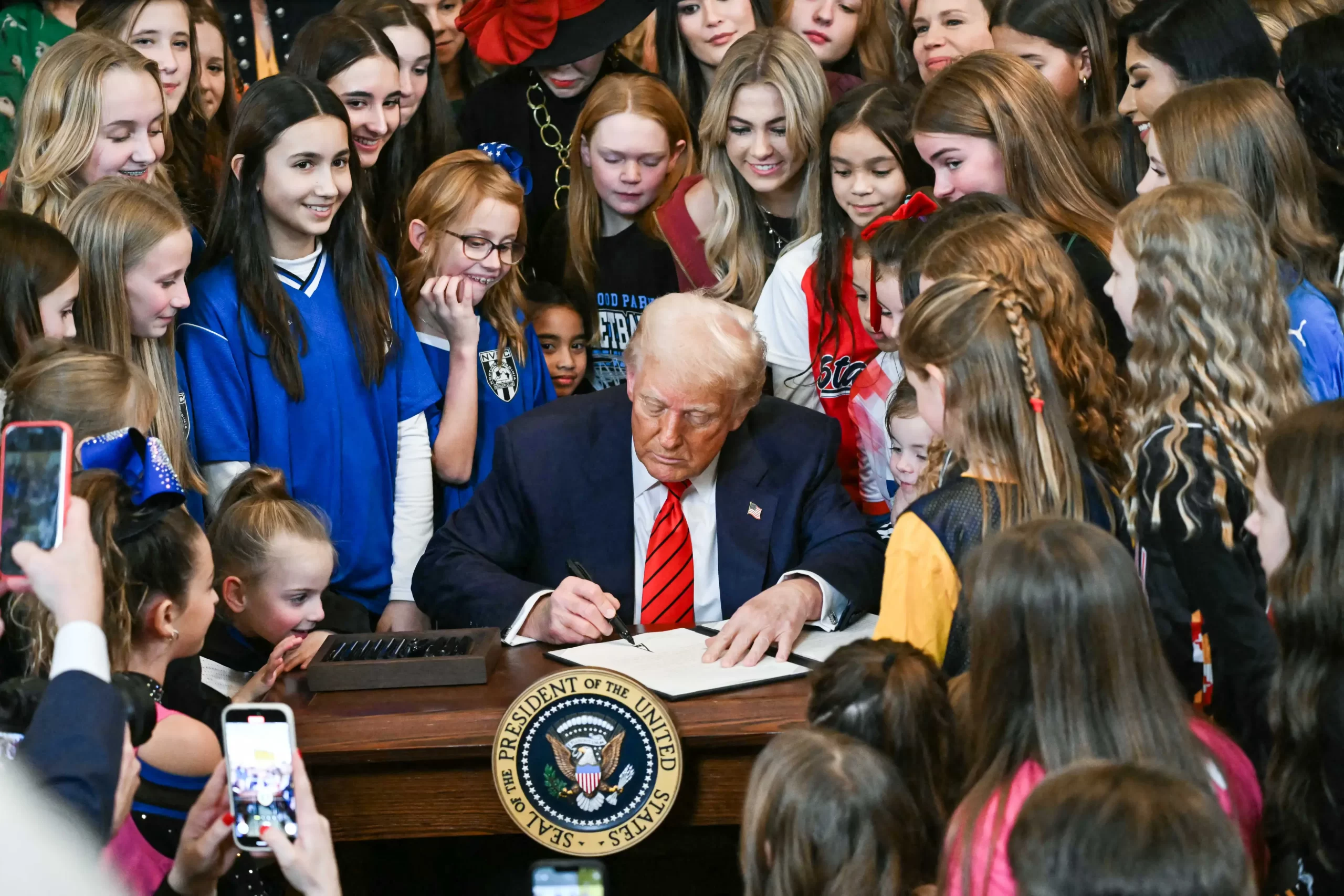 Prezident Donald Trump podepisuje exekutivní nařízení zakazující účast mužů v ženských sportech v Bílém domě, 5. února 2025. (Andrew Caballero-Reynolds / AFP via Getty Images)