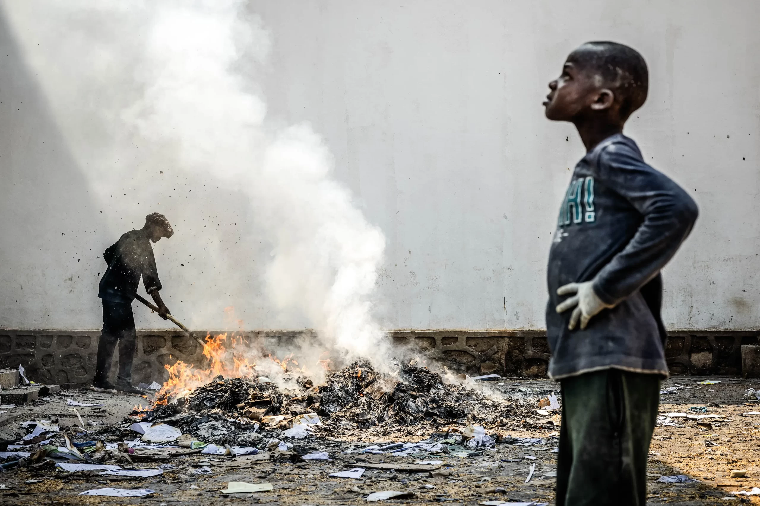 Muž prohledává ohořelé zbytky skladu Světového potravinového programu v Bukavu v Demokratické republice Kongo, 21. února 2025. (Luis Tato / AFP via Getty Images)