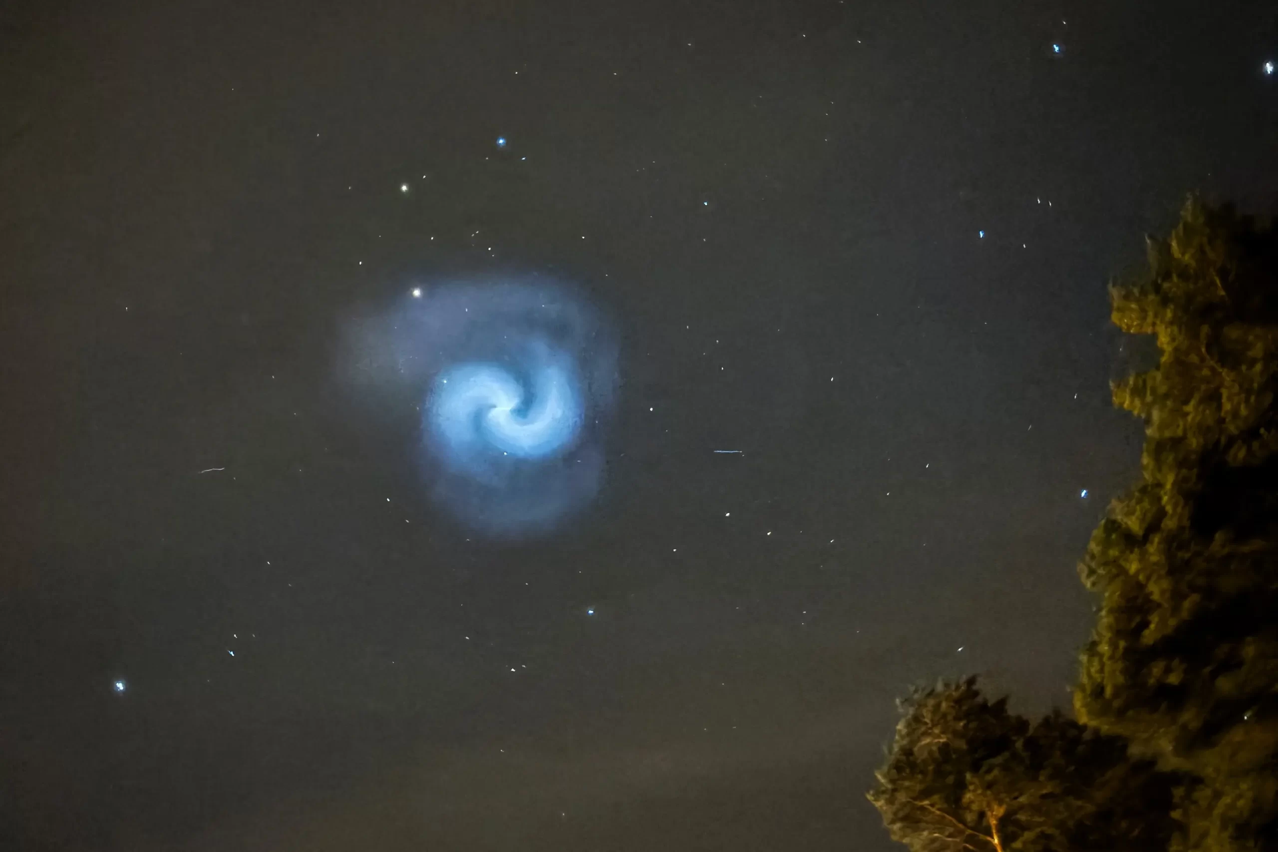 Modrobílá spirála na noční obloze nad Uppsalou ve Švédsku, 24. března 2025. (Bertrand Ilhe / AFP via Getty Images)