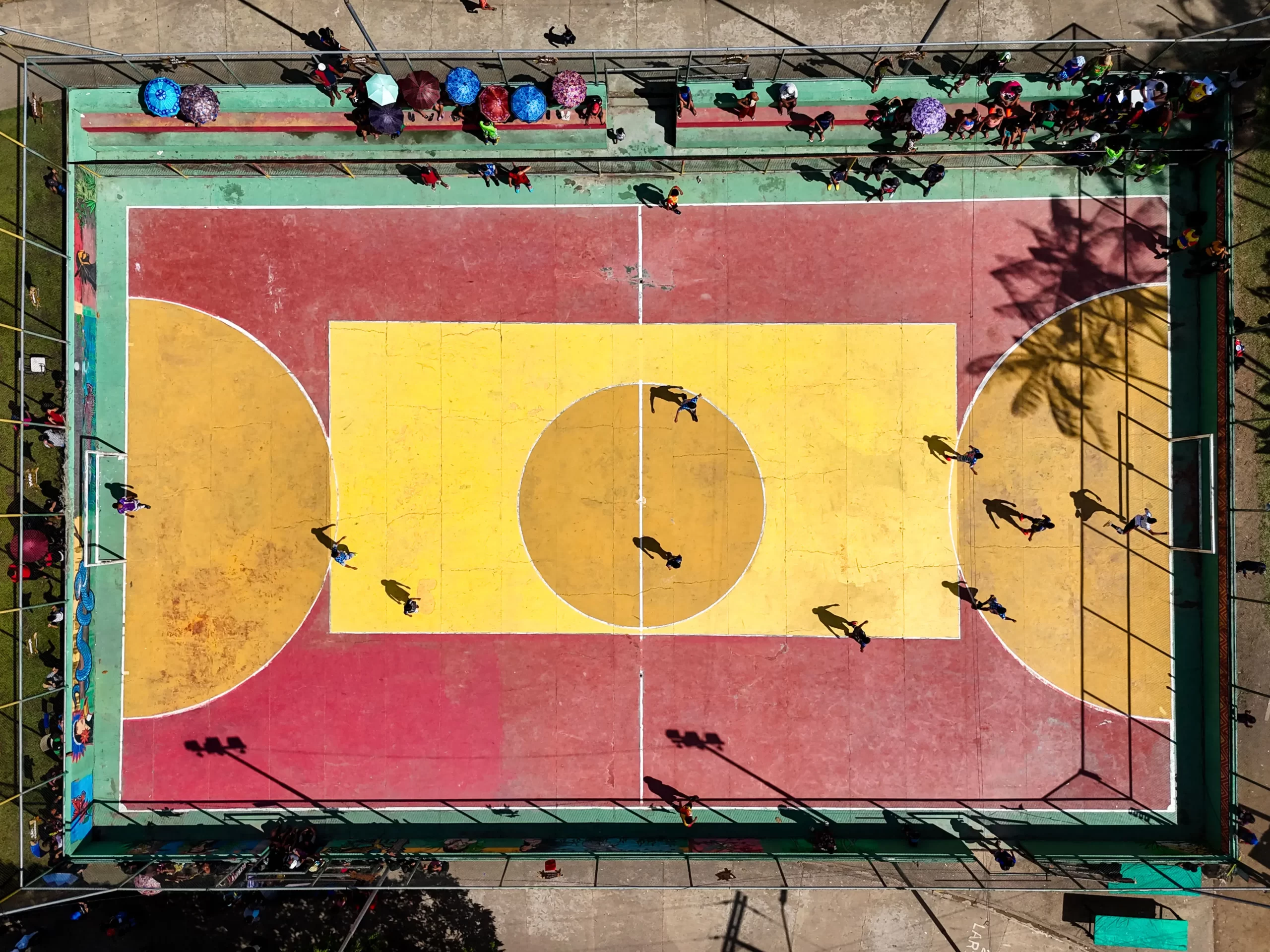 Letecký pohled na zápas futsalu během Mezikulturních her a tanců domorodých obyvatel Alvaraes ve vesnici Marajai ve státě Amazonas na severu Brazílie, 16. dubna 2025. Akce se koná pod heslem „Ochrana Matky Země“ a zaměřuje se na vymezování domorodých území, ochranu přírody a zachování domorodé kultury pro budoucí generace. (Michael Dantas / AFP via Getty Images)