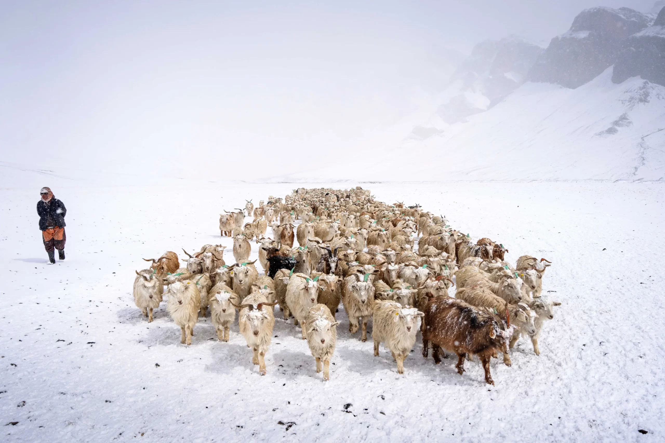 Kočovný pastevec vede stádo kašmírových koz na pastvu během sněžení na náhorní plošině Changthang ve východním Ladakhu v Indii, 19. dubna 2025. (Mohd Arhaan Archer / AFP via Getty Images)