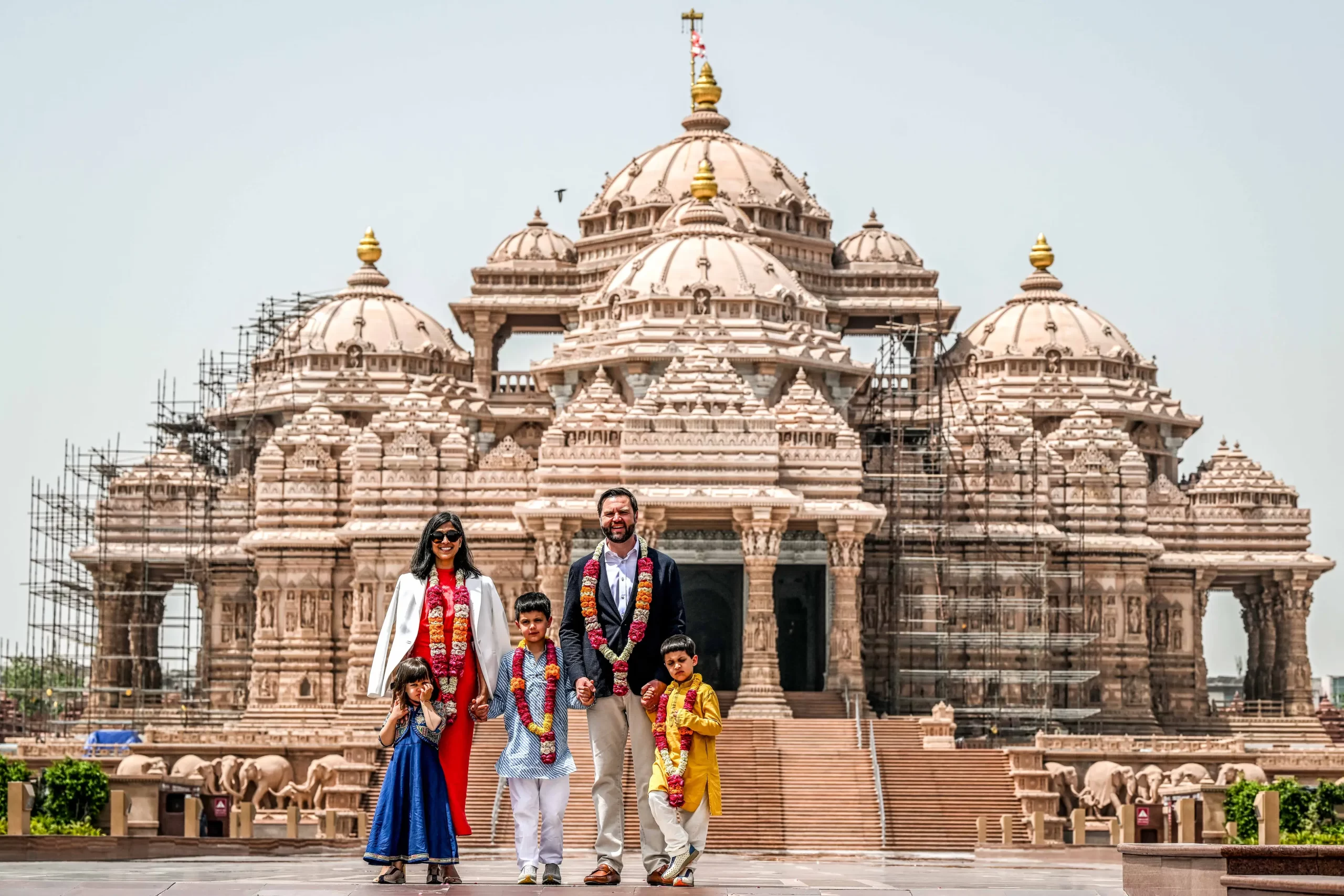 Viceprezident JD Vance (druhý zprava) a jeho manželka Usha Vanceová (druhá zleva) se svými dětmi Ewanem (uprostřed), Vivekem (vpravo) a Mirabel pózují před chrámem Akshardham v Novém Dillí v Indii, 21. dubna 2025. Vance zahájil čtyřdenní návštěvu Indie v době, kdy se Dillí snaží uzavřít předběžnou obchodní dohodu a odvrátit americká cla. Součástí cesty bylo i setkání s indickým premiérem Naréndrou Módím. (Kenny Holston / Pool / AFP via Getty Images)