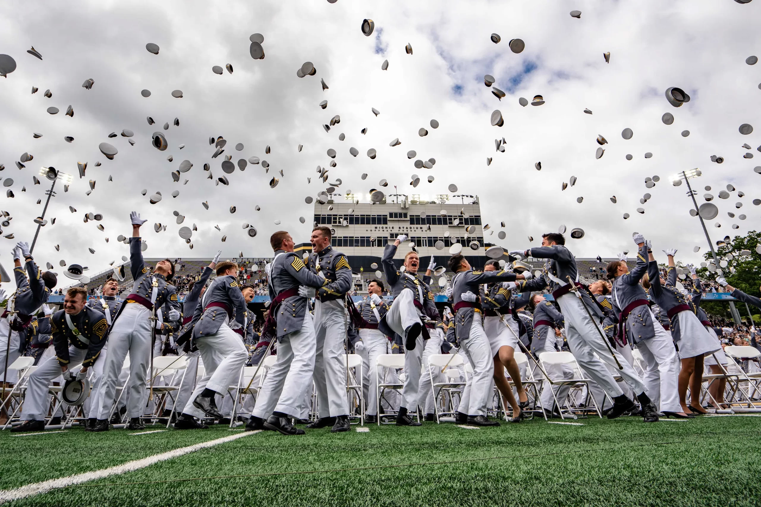 Kadetky a kadeti Vojenské akademie Spojených států vyhazují čepice při slavnostním promočním ceremoniálu ve West Pointu, 24. května 2025. (Samira Bouaou / The Epoch Times)