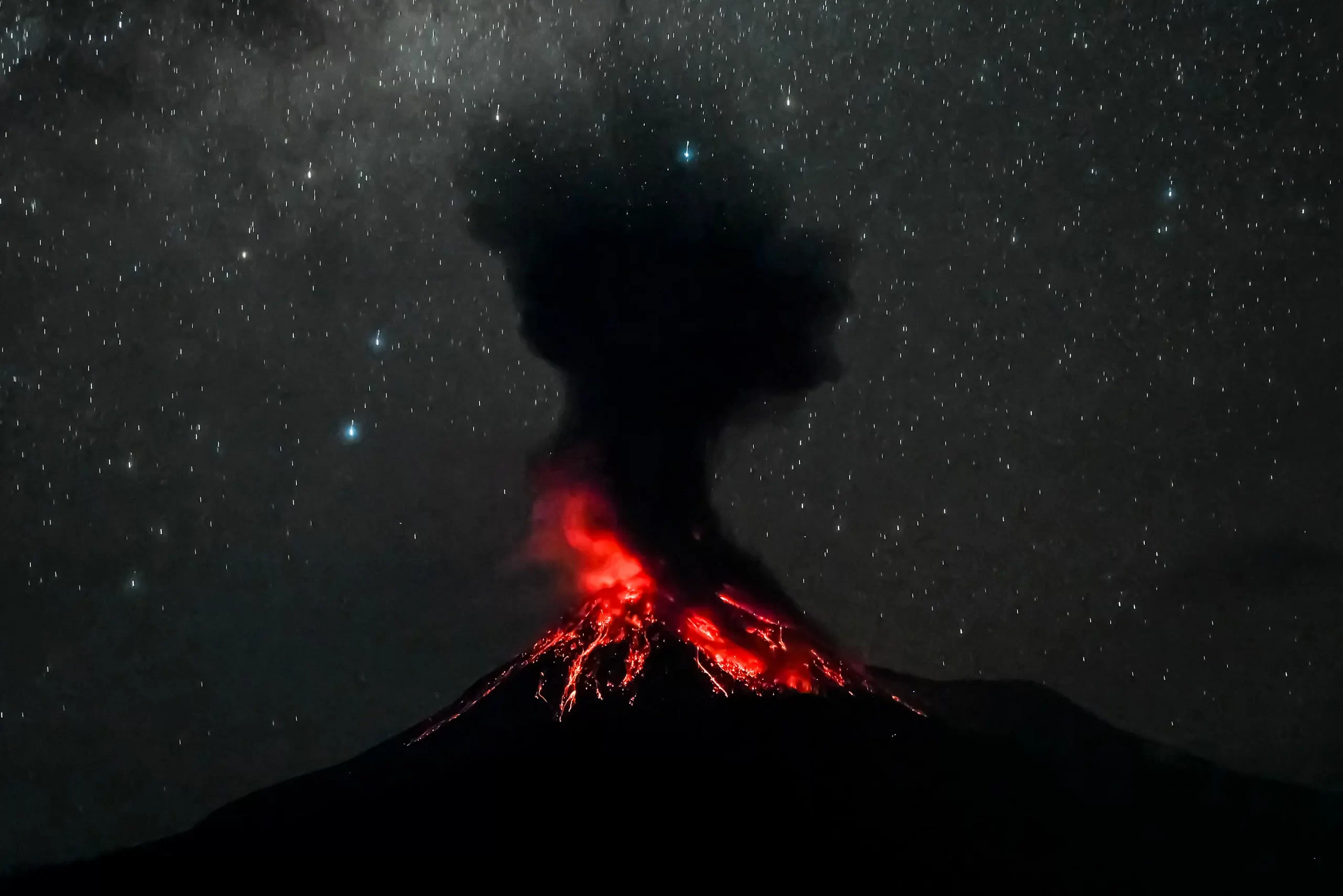 Letecký snímek zachycuje pyroklastický proud během erupce sopky Semeru v oblasti Lumajang na východní Jávě v Indonésii, 19. listopadu 2025. (Agus Harianto / AFP via Getty Images)
