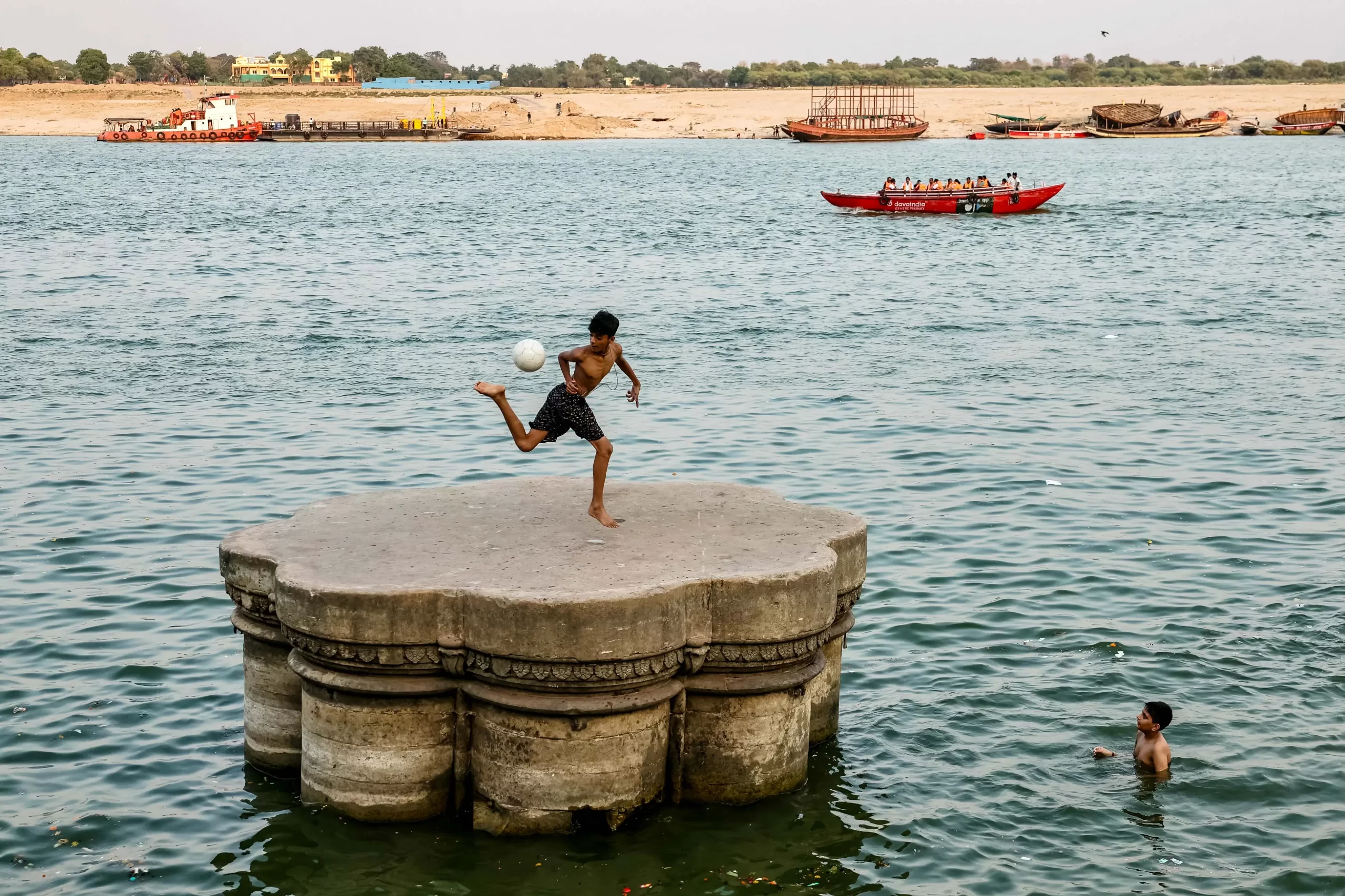 Chlapec si hraje s míčem na břehu řeky Gangy v ghátu Scindia Ghat ve Váránasí v Indii během horkého letního dne, 28. května 2025. (Niharika Kulkarni / AFP via Getty Images)