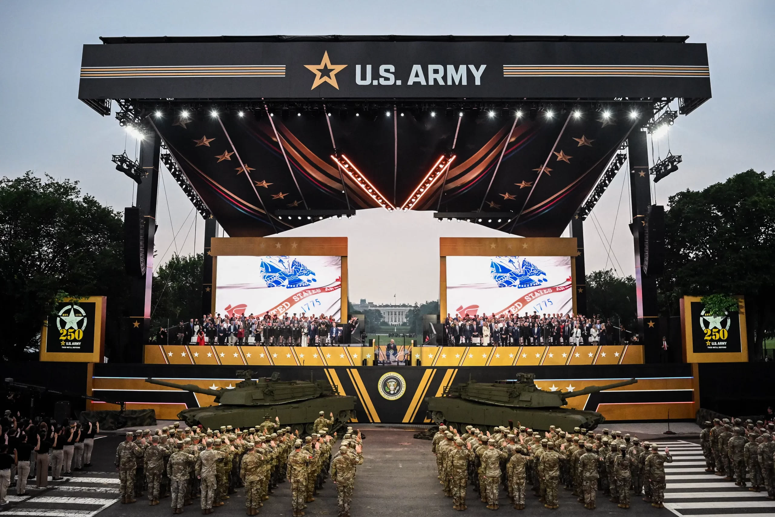 Prezident Donald Trump skládá přísahu vojákům během 250. výročí Armády Spojených států ve Washingtonu, 14. června 2025. (Mandel Ngan / AFP via Getty Images)