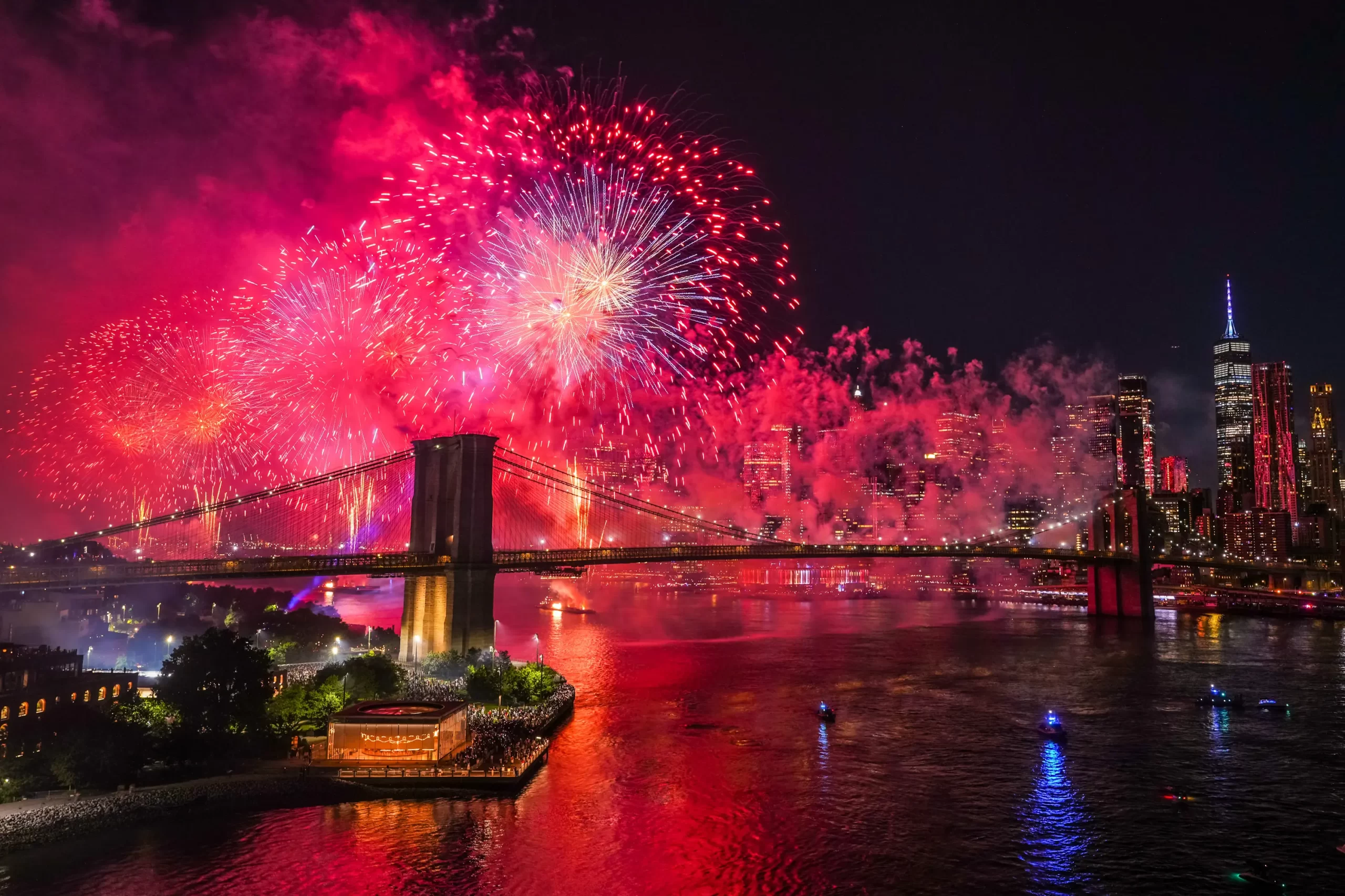 Lidé sledují ohňostroj nad Brooklynským mostem během tradiční show Macy’s ke Dni nezávislosti v New Yorku, 4. července 2025. (Adam Gray / Getty Images)