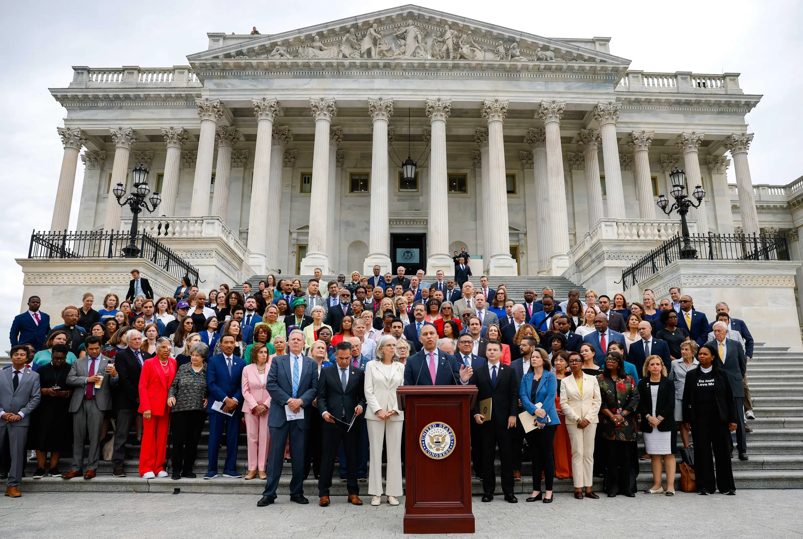 Vůdce menšiny Sněmovny reprezentantů Hakeem Jeffries (Demokraté – New York) vystupuje s dalšími demokraty proti zákonu One Big Beautiful Bill Act na tiskové konferenci před Kapitolem ve Washingtonu, 2. července 2025. (Kevin Dietsch / Getty Images)
