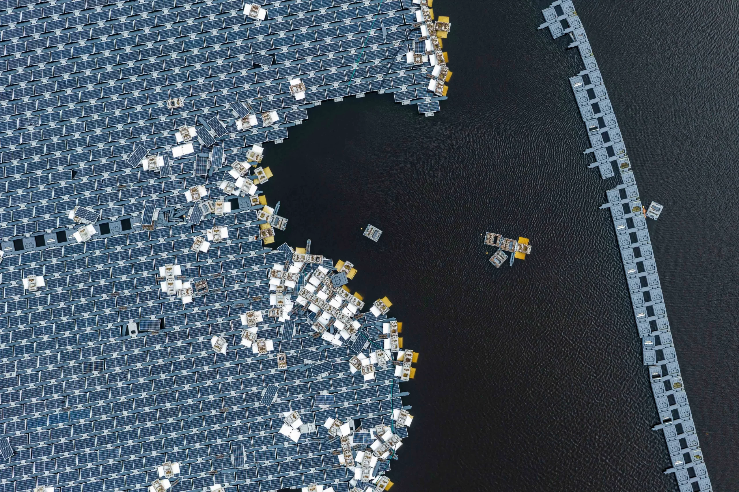 Letecký pohled na poškozené plovoucí fotovoltaické panely v retenční nádrži Xinwen po průchodu tajfunu Danas v okrese Chiayi na Taiwanu, 11. července 2025. Tajfun zasáhl západní pobřeží ostrova s větrem až 217 km/h a přívalovými dešti. (Annabelle Chih / Getty Images)
