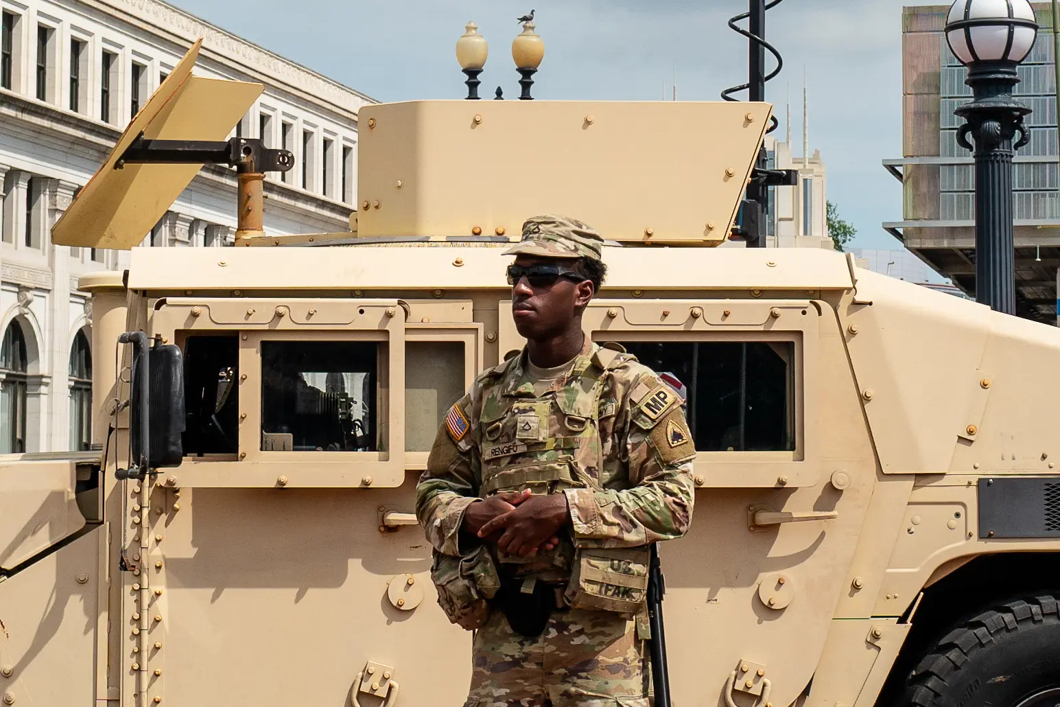Příslušník Národní gardy hlídkuje u nádraží Union Station ve Washingtonu, 14. srpna 2025. (Madalina Kilroy / The Epoch Times)