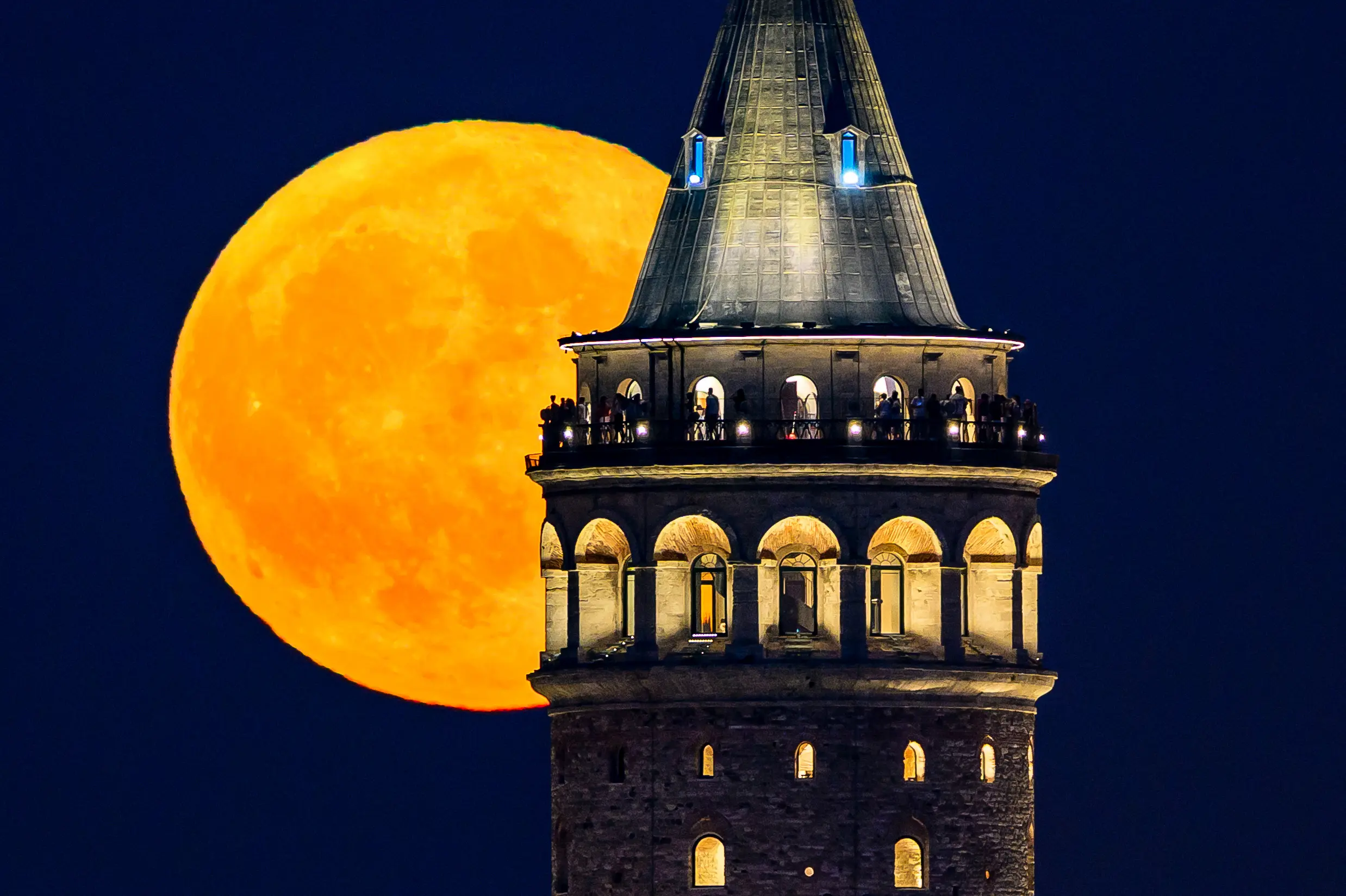 Měsíc zvaný Jeseterí měsíc vychází nad Galatskou věží v Istanbulu, 9. srpna 2025. (Asin Akgul / AFP via Getty Images)