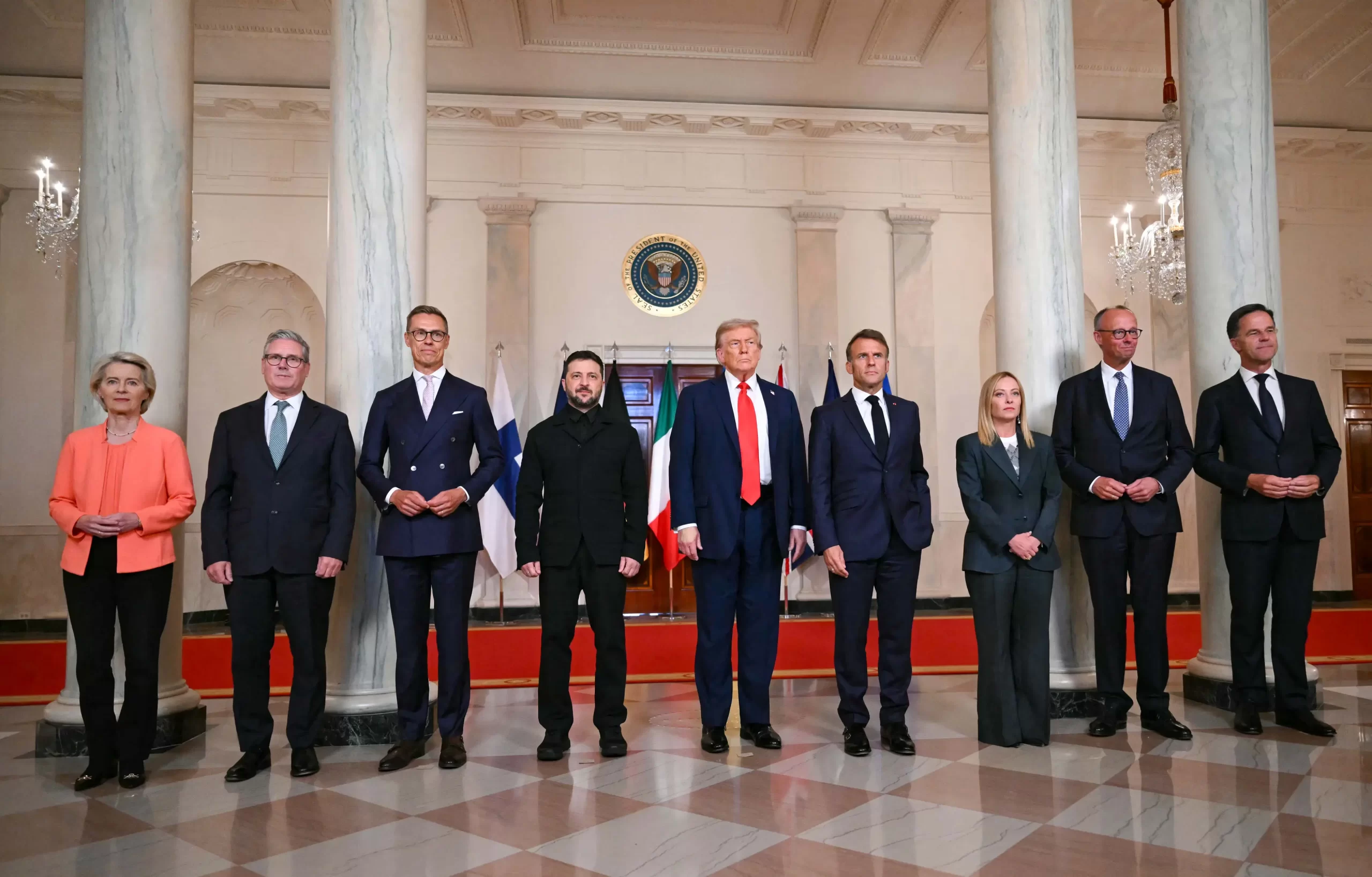 Světoví lídři pózují ke společné fotografii v Bílém domě během jednání o Ukrajině, Washington, 18. srpna 2025. (Andrew Caballero-Reynolds / AFP via Getty Images)