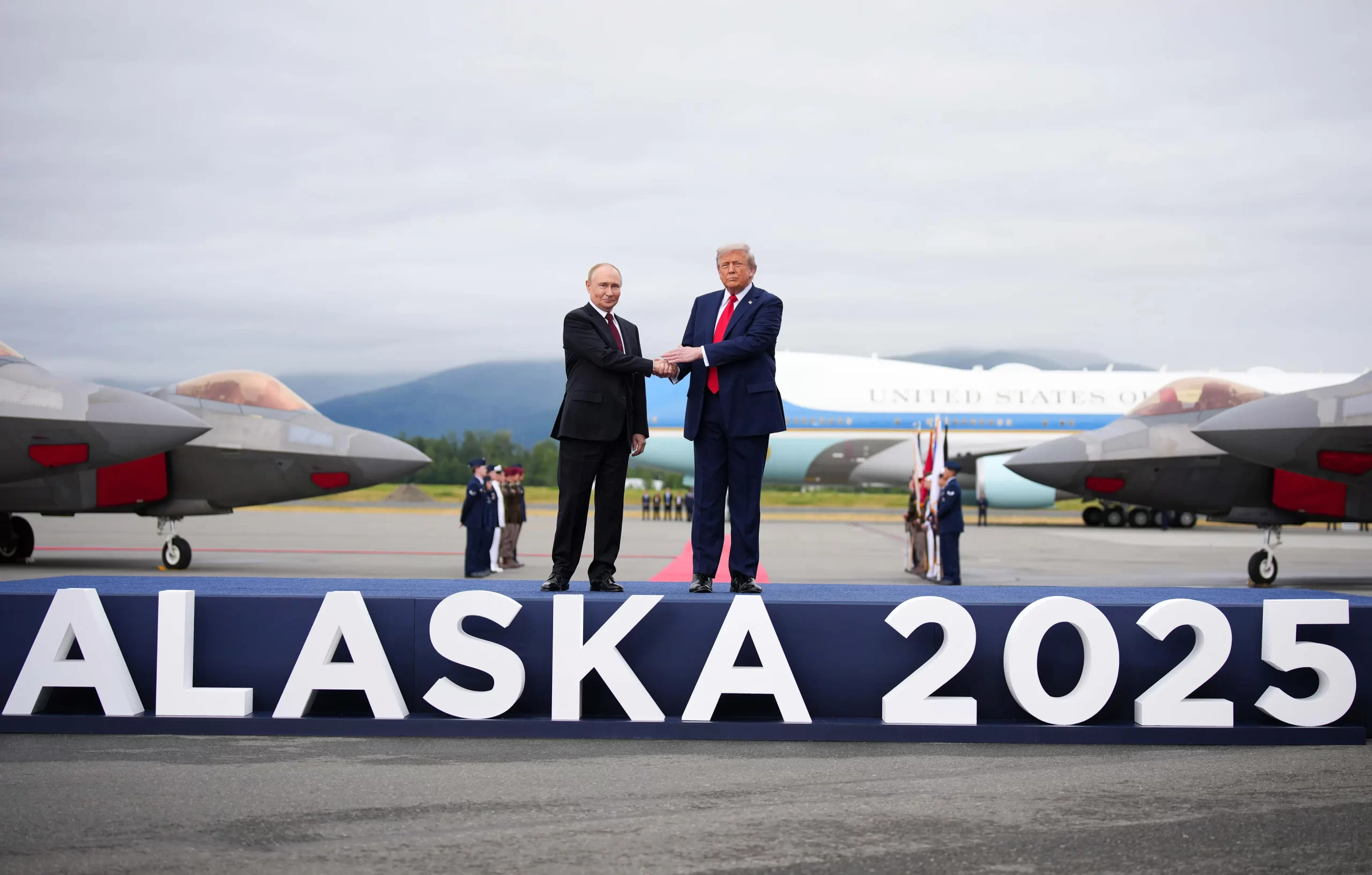 Prezident USA Donald Trump (vpravo) vítá ruského prezidenta Vladimira Putina při jeho příletu na leteckou základnu v Anchorage na Aljašce, 15. srpna 2025. (Andrew Harnik / Getty Images)