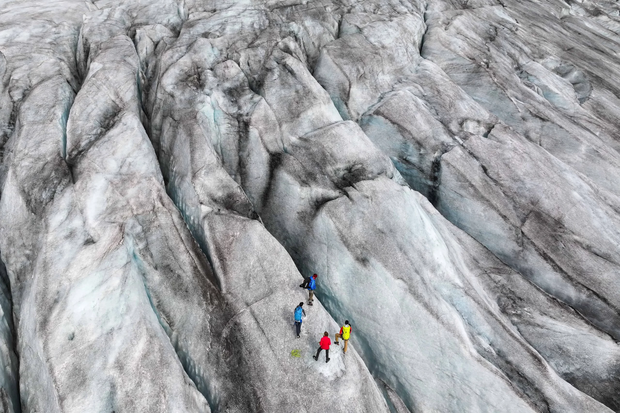 Letecký pohled na vědecký tým Curyšské polytechniky při sběru dat na ledovci Rhôna u obce Gletsch ve Švýcarsku, 22. srpna 2025. (Sean Gallup / Getty Images)