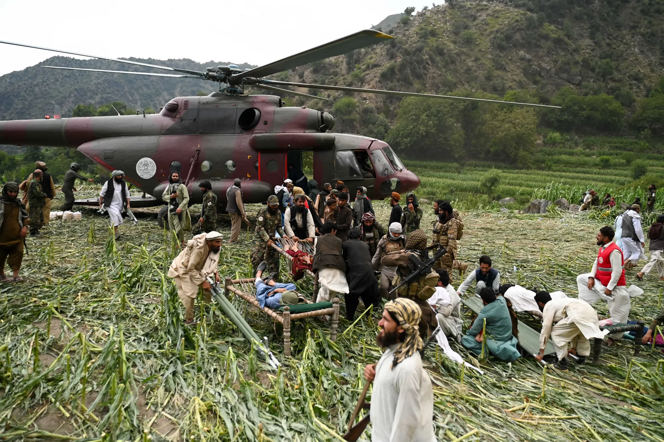 Dobrovolníci a příslušníci Tálibánu pomáhají zraněným po zemětřesení ve vesnici Mazar Dara v provincii Kunar v Afghánistánu, 1. září 2025. (Wakil Kohsar / AFP via Getty Images)