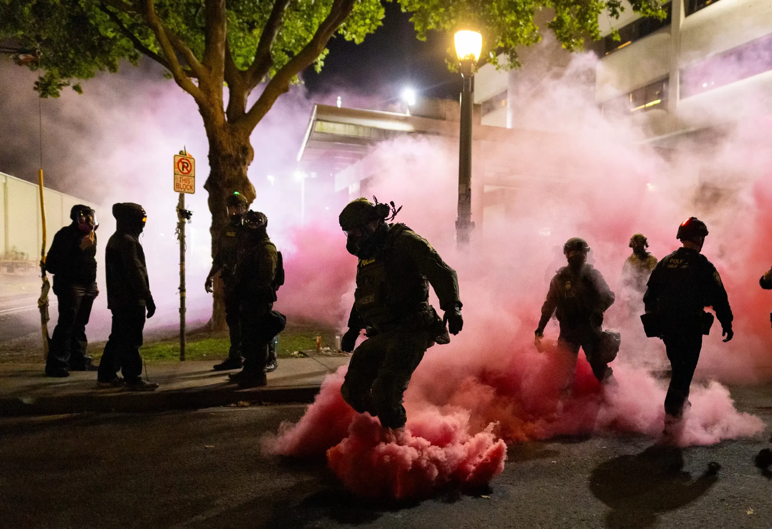 Federální agenti používají dýmovnice k odrazení demonstrantů před kancelářemi imigračního a celního úřadu (ICE) v Portlandu v Oregonu, 5. října 2025. Protesty propukly poté, co Trumpova administrativa oznámila plán vyslat do Portlandu jednotky Národní gardy. (John Fredricks / The Epoch Times)