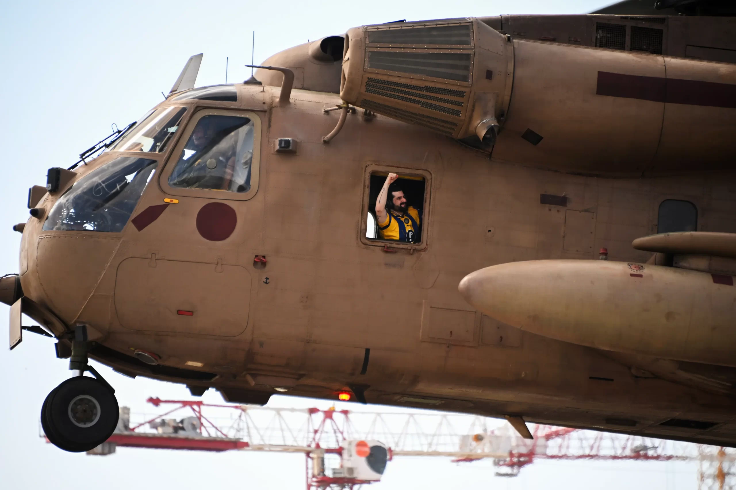 Propuštěný izraelský rukojmí Ziv Berman slaví z vrtulníku při příletu do zdravotnického centra Chaim Sheba v Tel HaShomeru v Ramat Ganu v Izraeli, 13. října 2025. (Alexi J. Rosenfeld / Getty Images)
