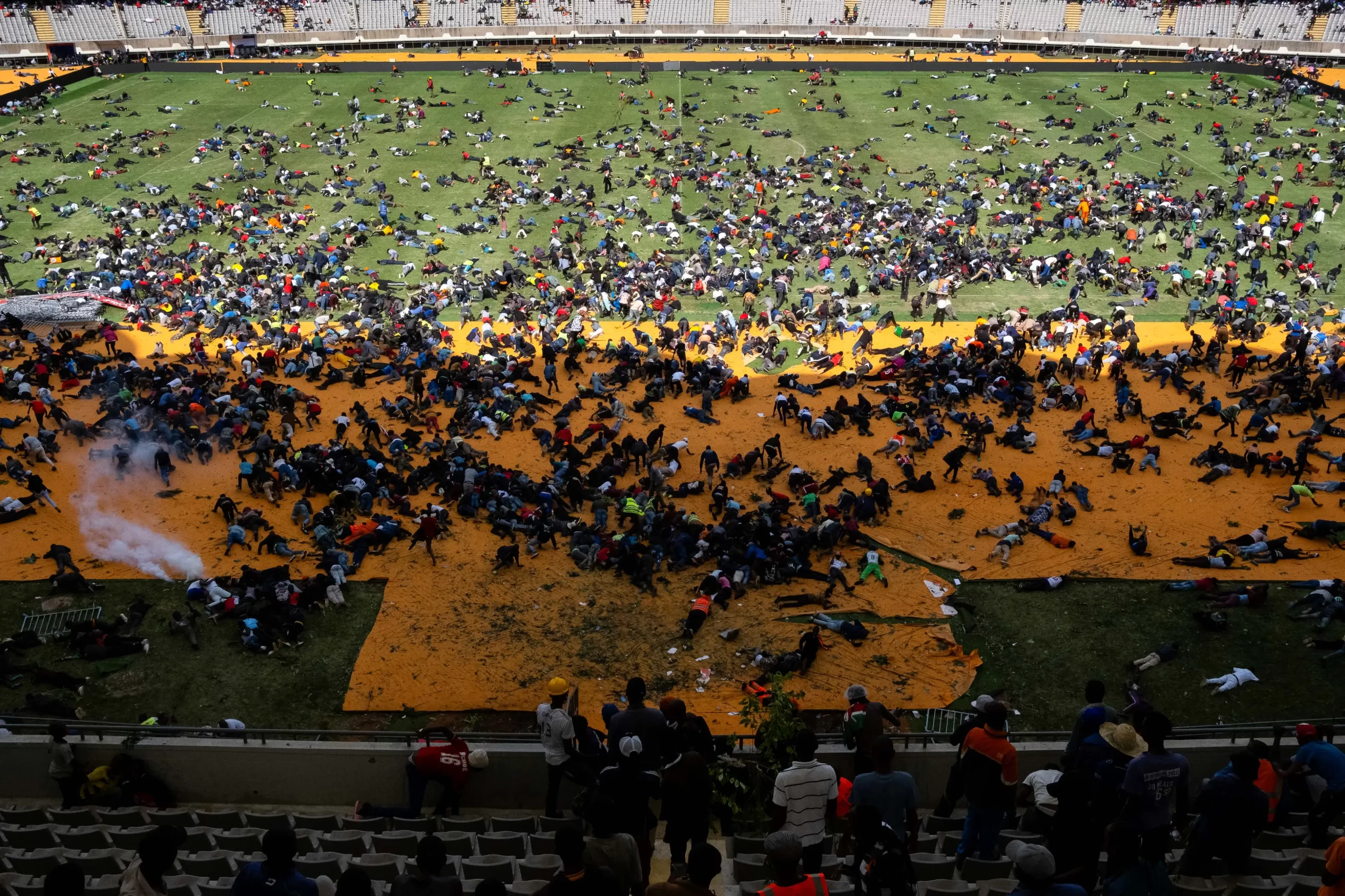 Stoupenci a truchlící keňského opozičního lídra Raila Odingy utíkají poté, co byly během shromáždění k veřejnému vystavení jeho rakve na stadionu Kasarani v Nairobi vypáleny výstřely a použit slzný plyn, 16. října 2025. Odinga zemřel ve věku 80 let během zdravotní návštěvy Indie. (Kabir Dhanji / AFP via Getty Images)
