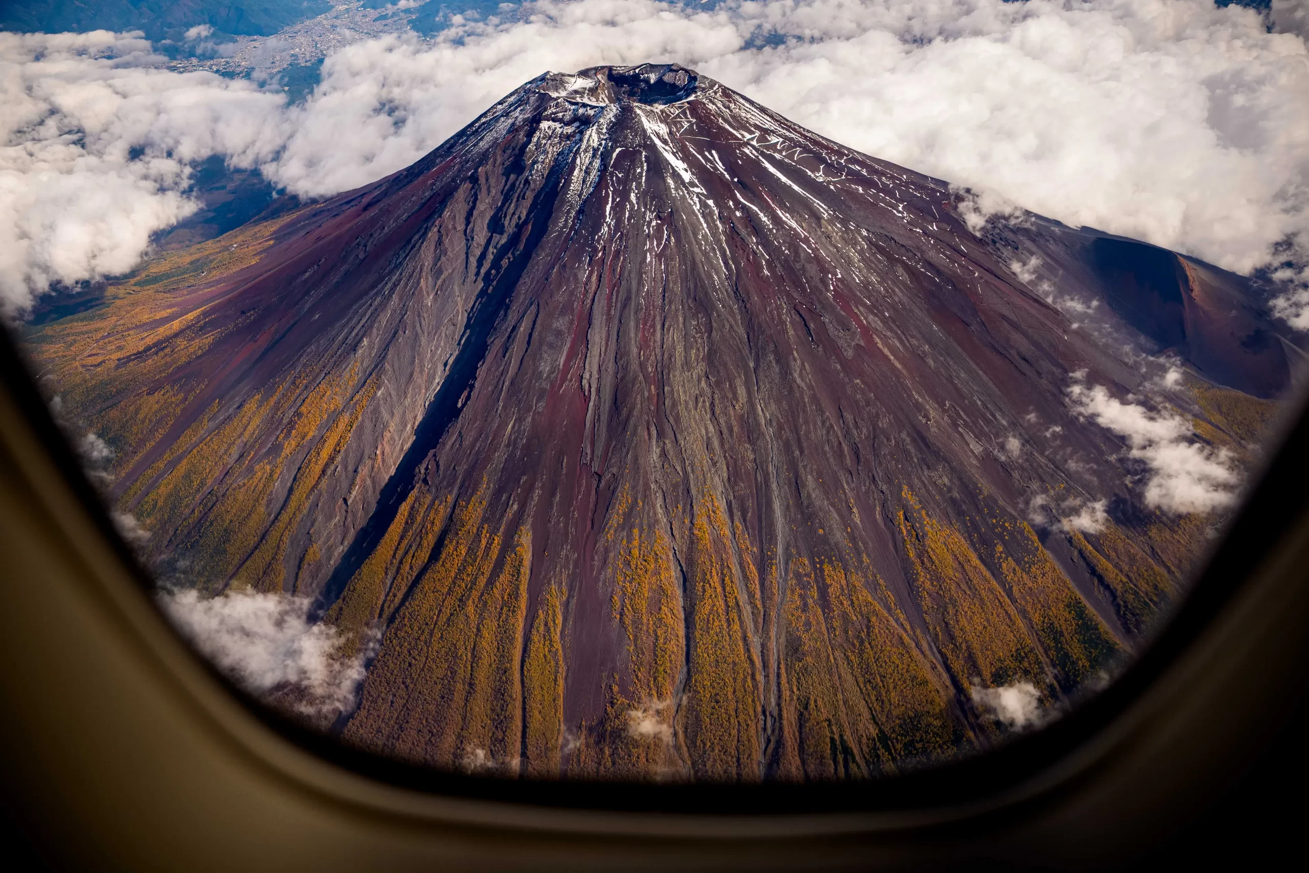 Hora Fudži je vidět z paluby letounu Air Force One během letu prezidenta USA Donalda Trumpa do Jižní Koreje, Japonsko, 29. října 2025. (Andrew Harnik / Getty Images)