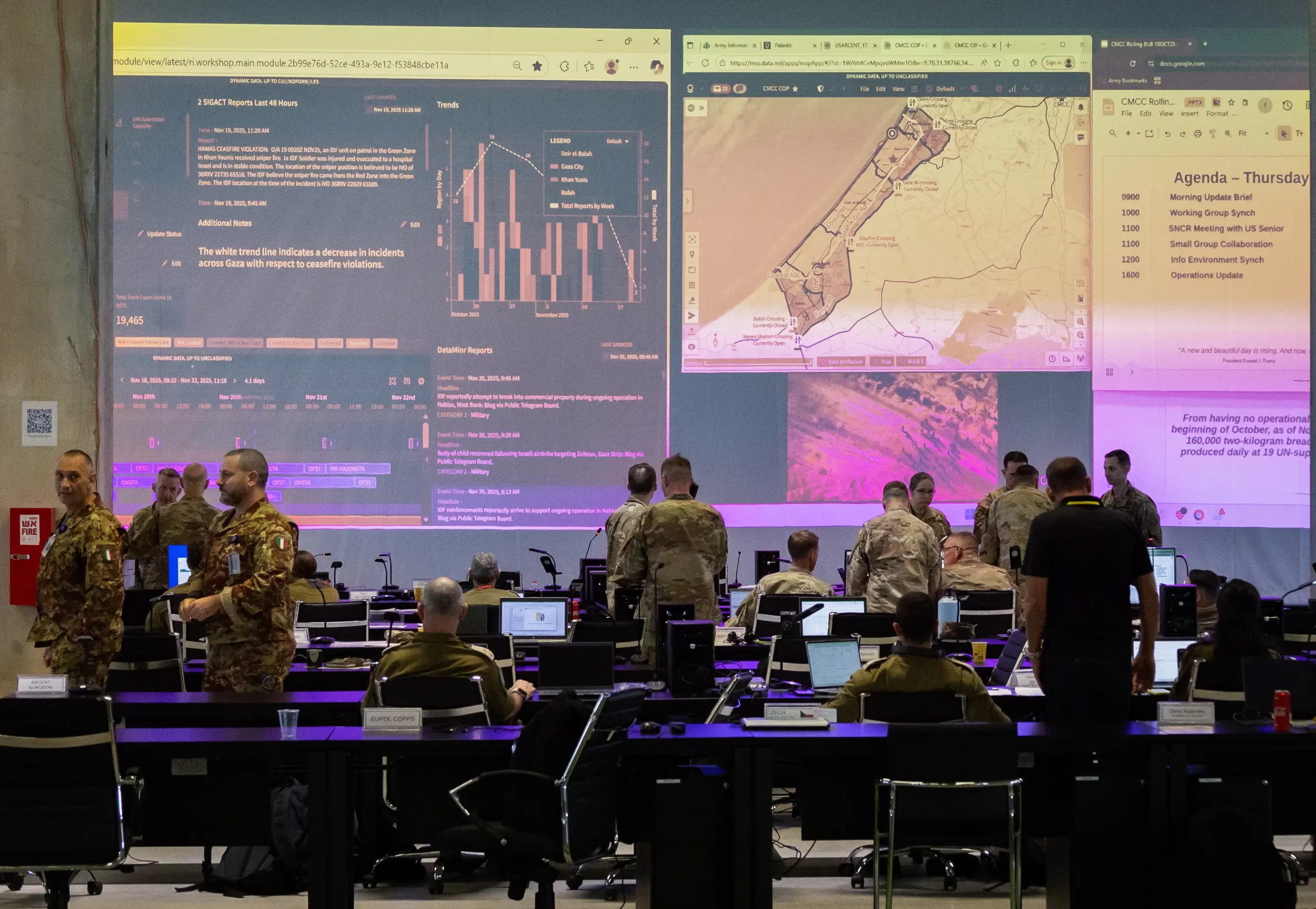 Koalice amerických, izraelských a zahraničních armád spolu s mezinárodním civilním personálem poskytuje humanitární pomoc obyvatelům Pásma Gazy v Centru civilně-vojenské koordinace v Kiryat Gatu v Izraeli, 20. listopadu 2025. (John Fredricks / The Epoch Times)